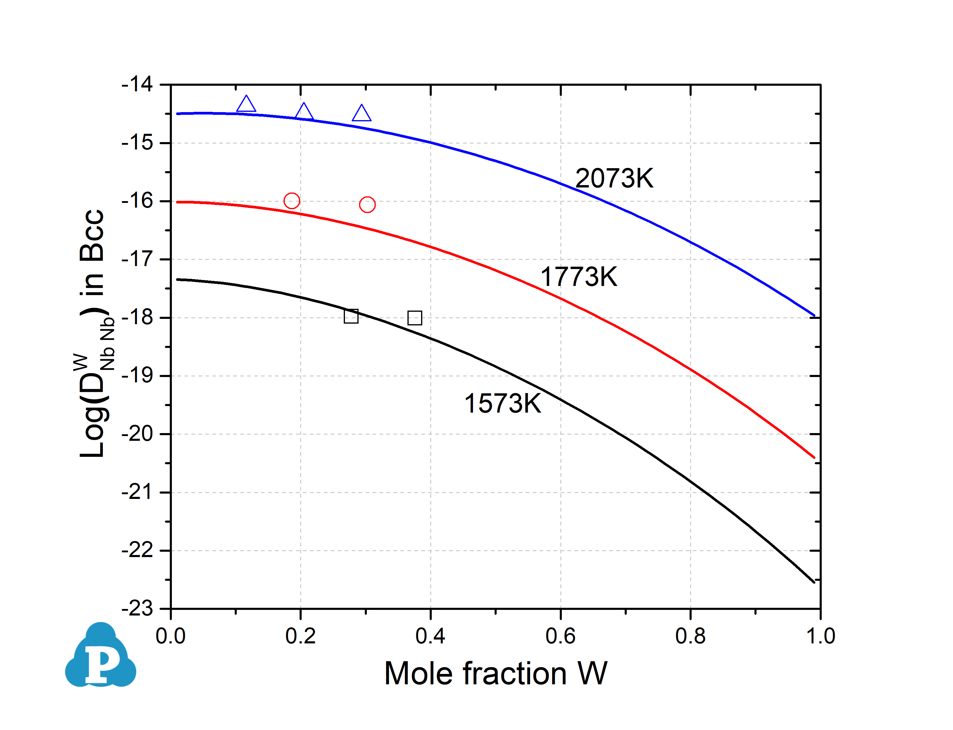 Figure 2.2: Inter-diffusion coefficients of Nb in bcc Nb-W alloys at different temperatures[2013Liu]