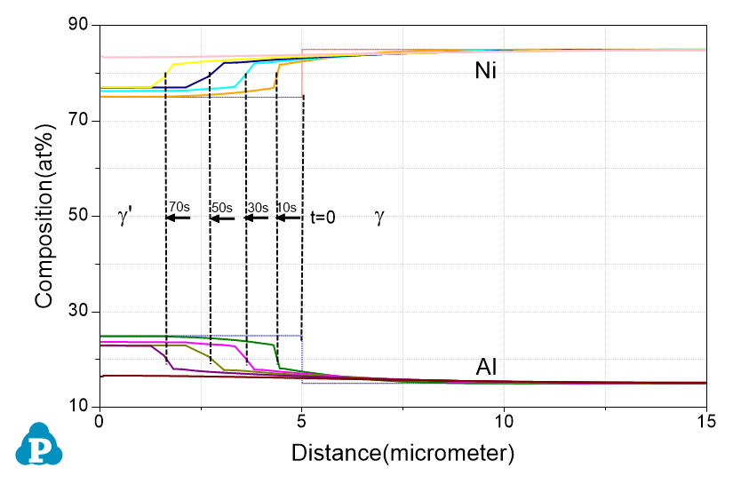The PanDiffusion module was developed for the simulation of diffusion kinetics of multi-component alloys. In Figure 2.5, dissolution of γ' particle in Ni-Al binary system was simulated for demonstration. The initial matrix composition is Ni-15at.%Al and that of the γ' particle is set as Ni-25at.%Al at the beginning with the radius of 5μm. The simulated composition profiles at 1200 °C for different time are shown in Figure 2.5. One can see that the γ' particle can be completed dissolved within a few minutes at 1200 °C. In this simulation, the combined thermodynamic and mobility database of Ni-based superalloys, PanNi_TH+MB, is used. More information regading to diffusion simulation can be found in PanDiffusion module under the Software section.