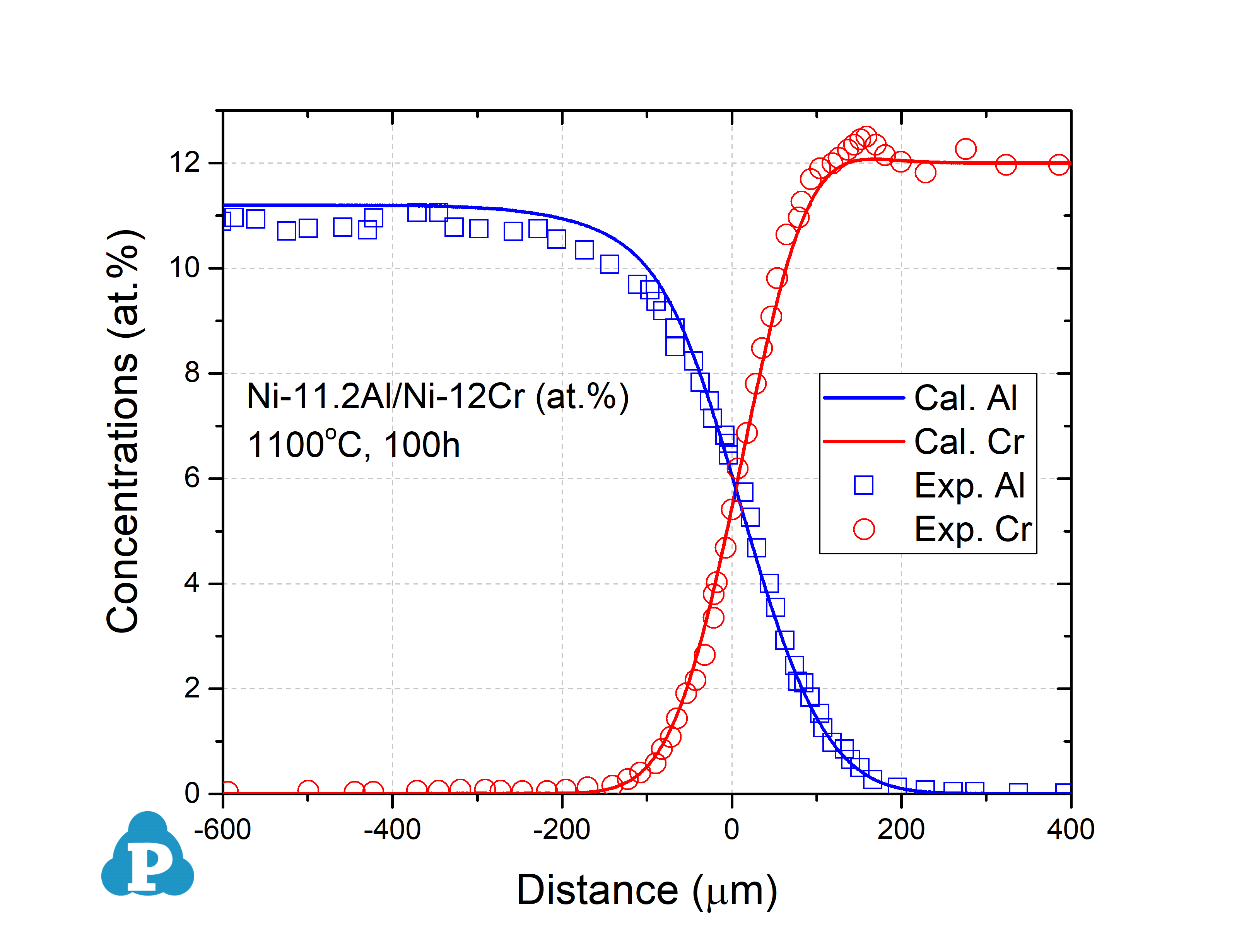 Figure 2.1: Concentration profiles of Ni-11.2Al/Ni-12Cr (at.%) at 1100 °C for 100h [1996Eng]