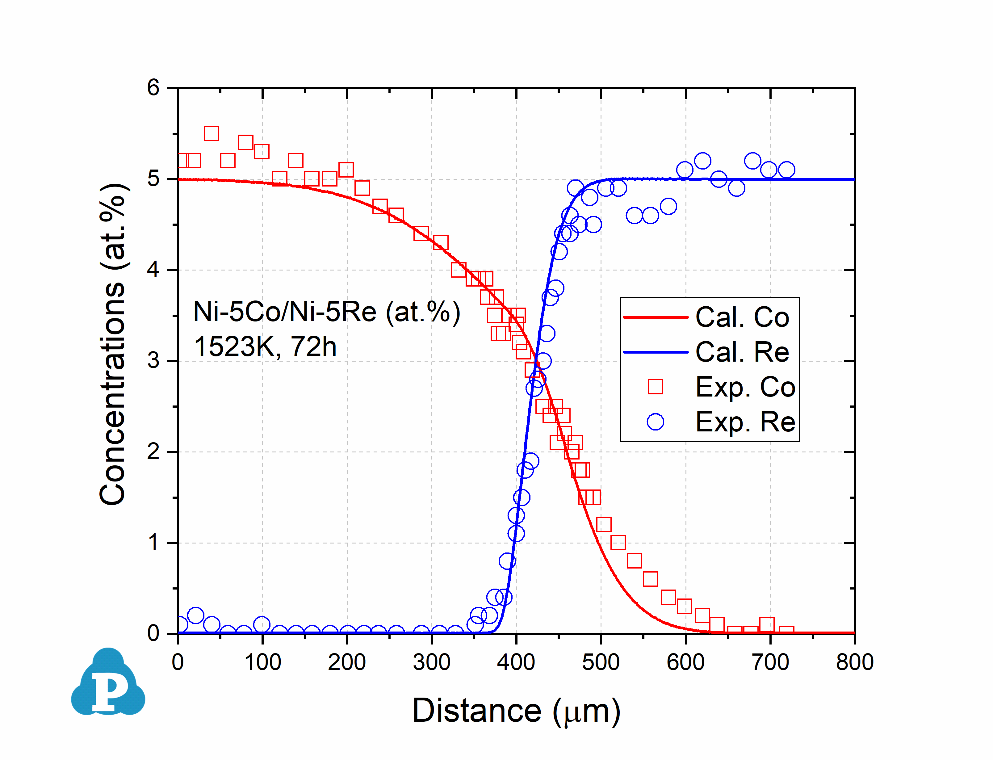 Figure 2.2: Concentration profiles of Ni-5Co/Ni-5Re (at.%) annealed at 1523K for 72h [2014Liu]