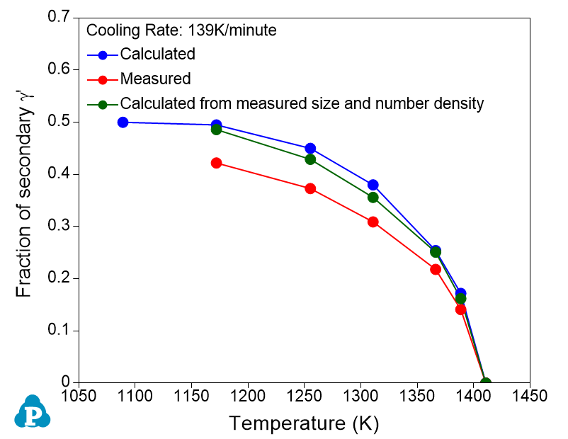 The module was developed for the simulation of precipitation kinetics of multi-component alloys. It has been seamlessly integrated with the thermodynamic calculation engine of the software, and has been used to simulate the evolution of microstructure and the corresponding mechanical property responses to heat treatment of Ni-based superalloys. Below shows an example simulation performed for the LSHR alloy solutionized at supersolvus temperature 1463K for 20 minutes to dissolve γ' and homogenize the chemistry throughout the γ grain. These samples were then cooled at a rate of 11K/min or 139K/min to a predetermined temperature within the range of 1089K to 1411K, then quenched. The simulated γ' precipitates evolution is compared with experimental data as shown in Figure 2.3 and Figure 2.4. As is seen, the model calculated values agree well with those directly measured. The slow cooling rate leads to bimodal distribution of secondary γ' with much bigger particle size of secondary γ' (~3 times as big as the fast cooling rate) and slightly higher volume fraction of secondary γ'. The database used to do this simulation is the combined thermodynamic and mobility database of Ni-based alloys: PanNi_TH+MB. More information regarding to precipitation simulation can be found in PanEvolution module under the Software section.