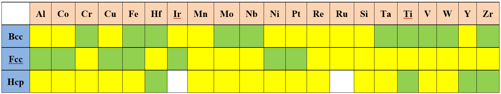 The self-diffusivity of an element is usually described by an analytical expression. For the stable crystal structures, these expressions can be obtained using the available experimental data, while those for the metastable/unstable states are usually estimated from those of the stable states. In the following tables, we use different color to represent different status: