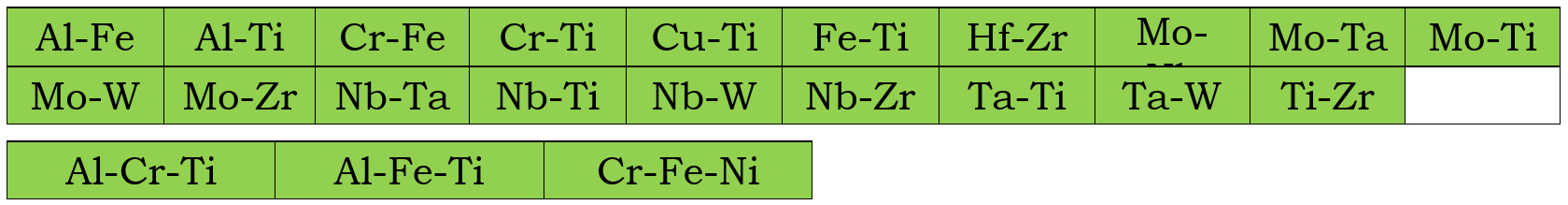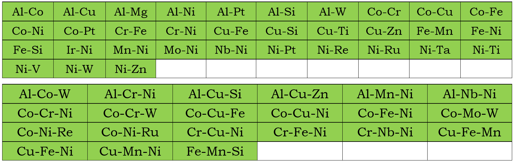 In addition to the assessed self-diffusivities shown above, the impurity diffusion data for all elements included in the current mobility database are also assessed. Moreover, chemical-diffusivities available in some binary and ternary systems are also used to assess the interaction parameters. These binary and ternary systems are listed below for the Bcc and Fcc phases.
