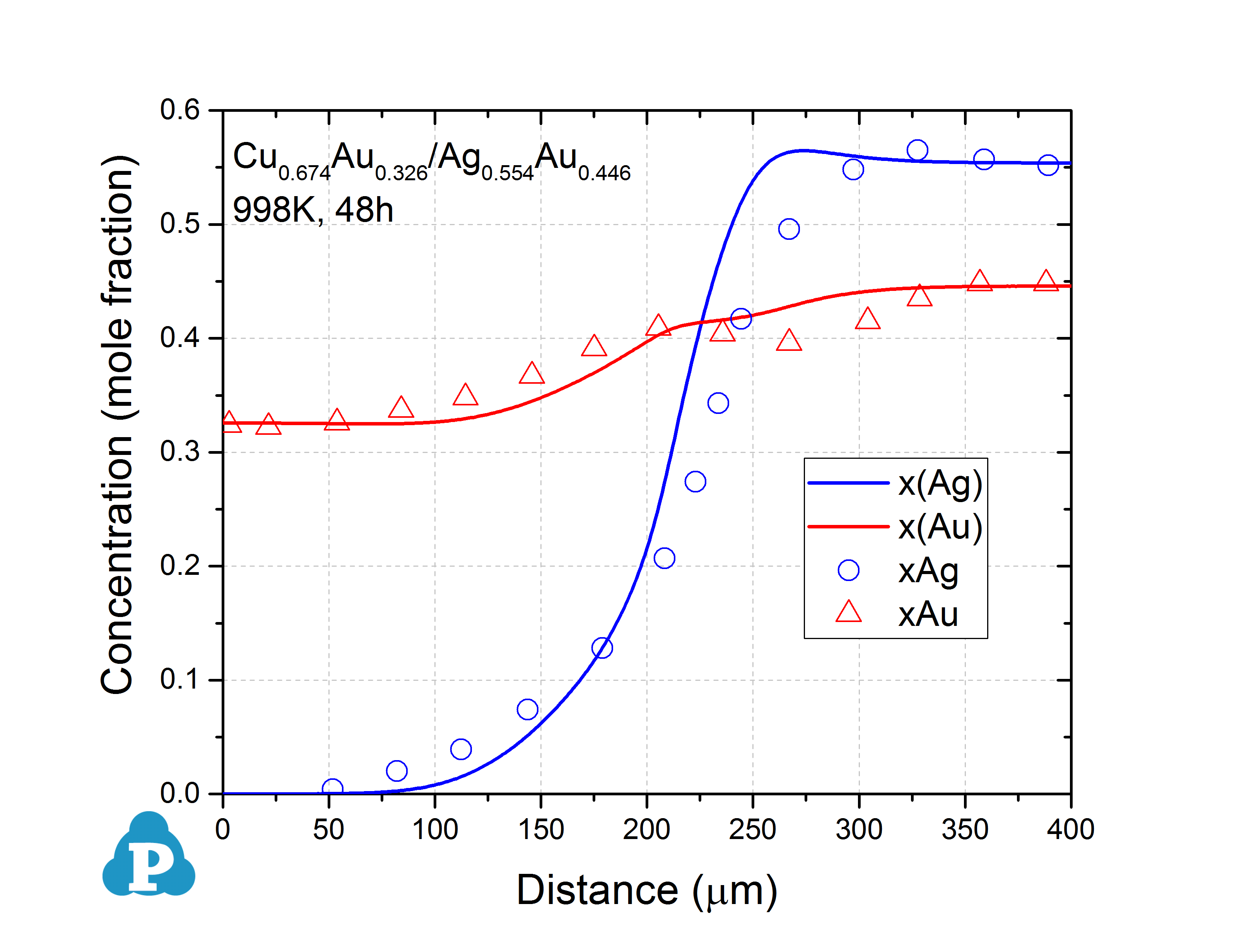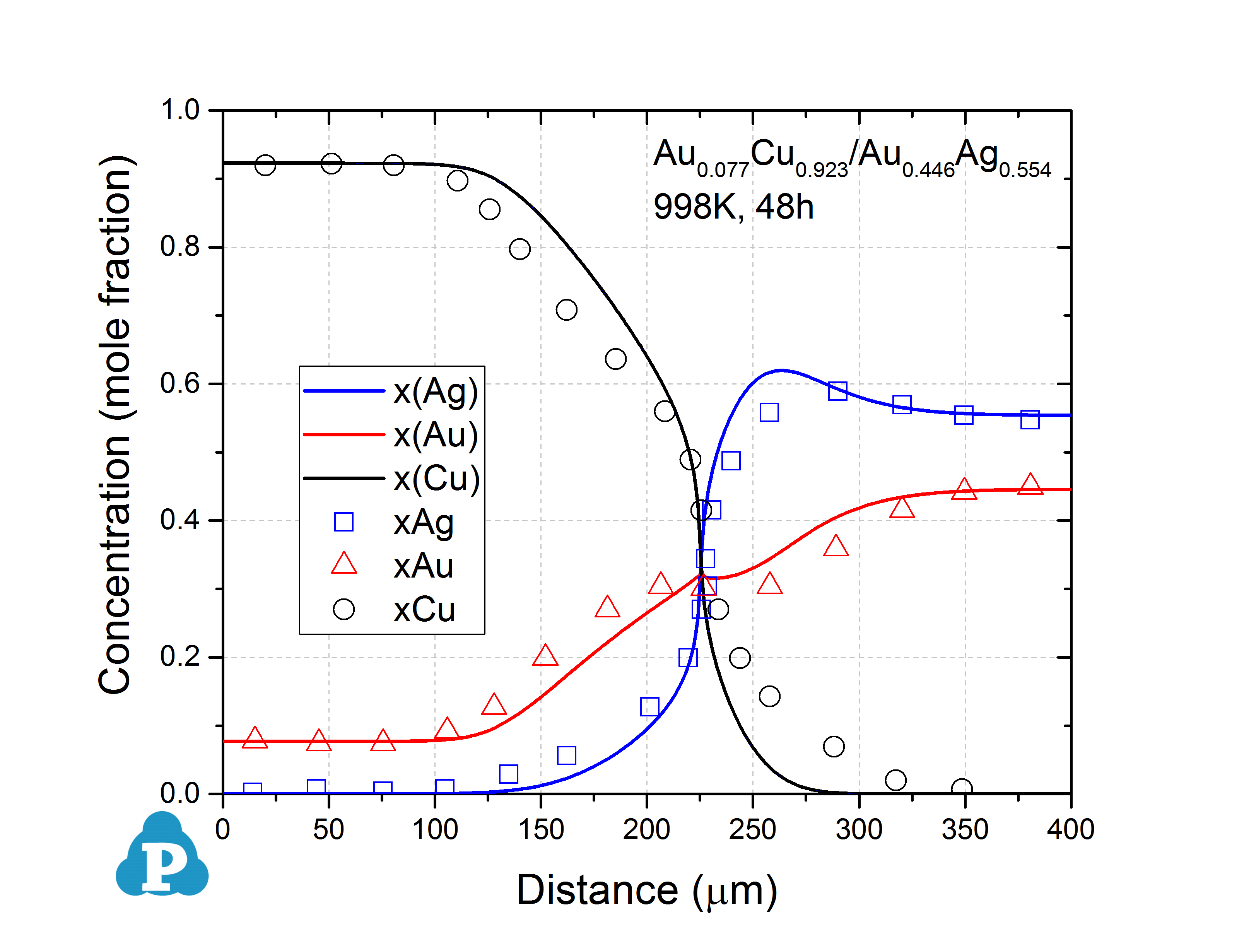 Figure 2.2: Concentration profiles of Au0.077Cu0.923/Au0.446Ag0.554 annealed at 998K for 48h [2011Liu]