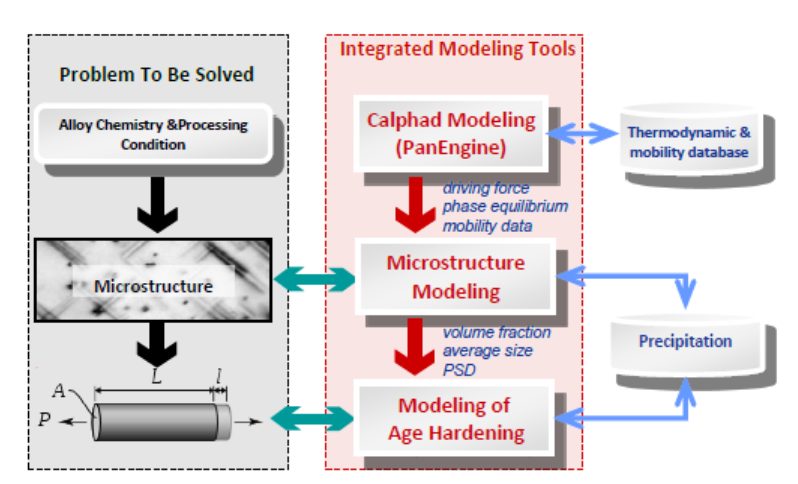 The new PanEvolution module (an extension of the previous PanPrecipitation) enables the concurrent simulation of dislocation density, recrystallization, grain coarsening, in addition to the traditional precipitation simulation. The module is seamlessly integrated with the thermodynamic calculation engine, PanEngine, for the necessary thermodynamic input and mobility data. It is built as a shared library and integrated into Pandat as a specific module that extends the capability of Pandat for kinetic simulations, while taking full advantage of the automatic thermodynamic calculation engine (PanEngine) and the user-friendly Pandat Graphical User Interface (PanGUI). For this reason, precipitation simulations for highly complex alloys under arbitrary heat treatment conditions can be accomplished with only a few operations Figure 5.1 shows the three-layered architecture of this modeling tool.