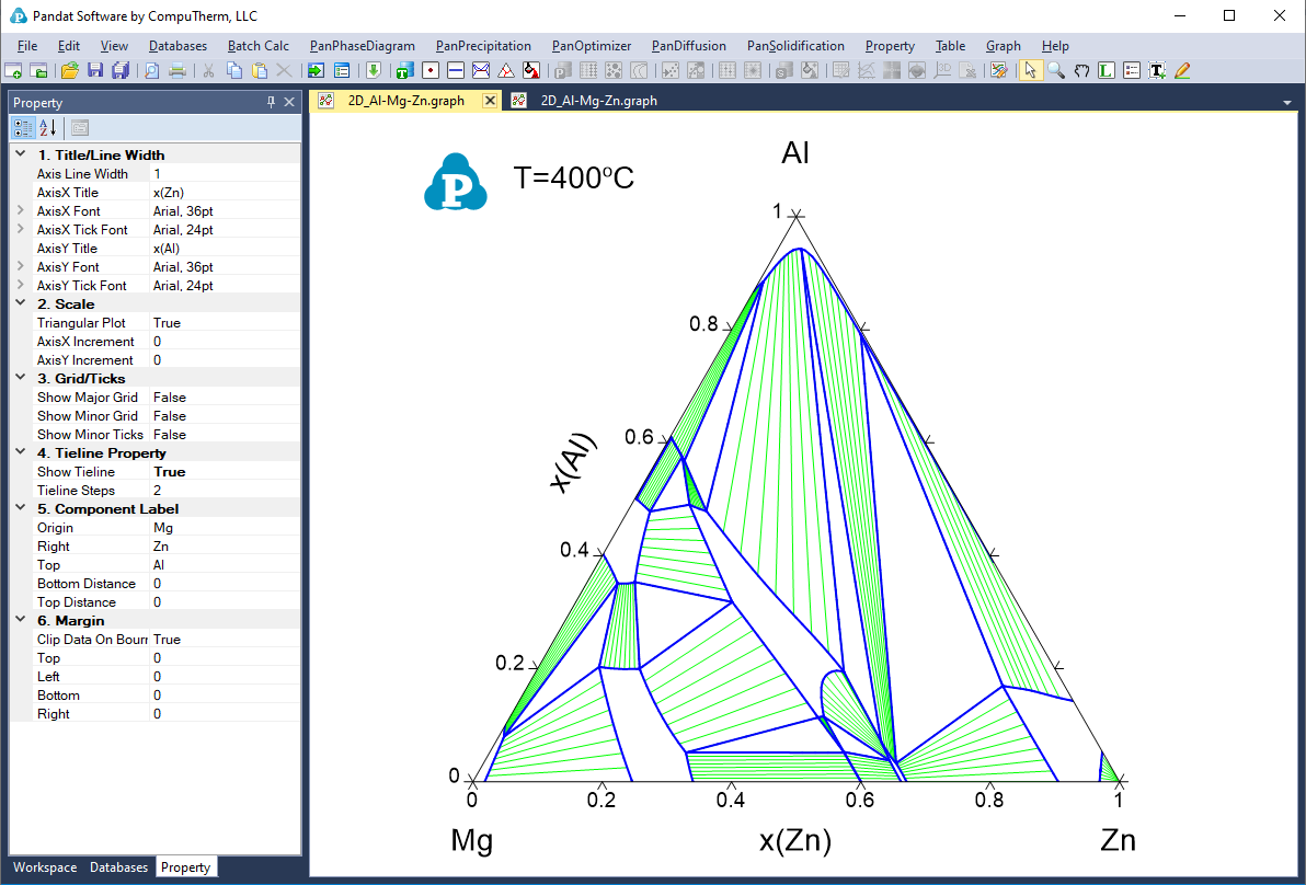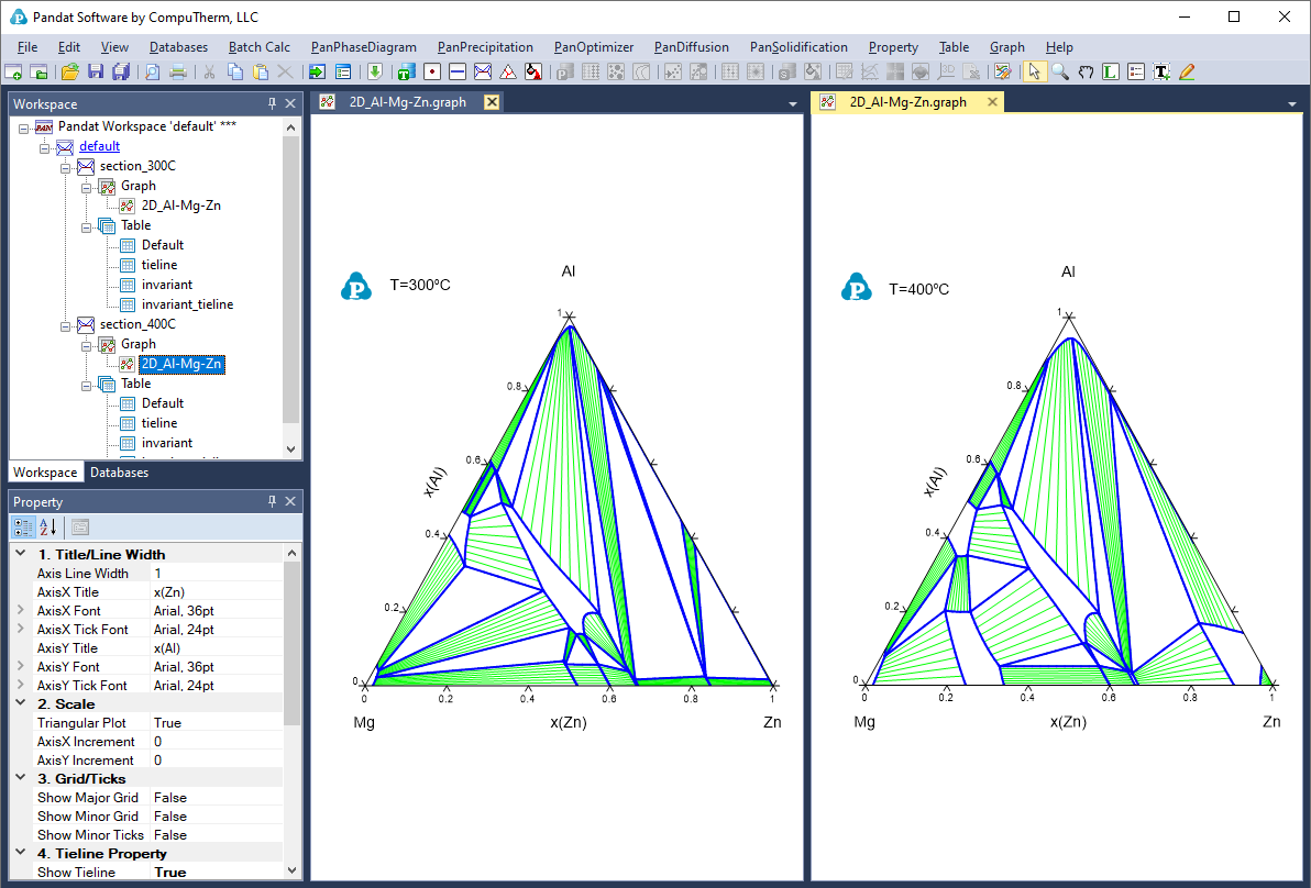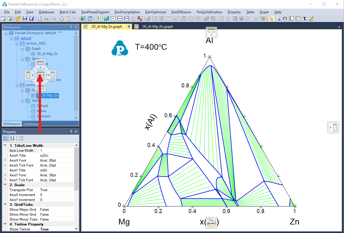 The property window is located below the explorer window. In Pandat, object selection is carried out by single click. Based on the selected object, the properties of the plotted lines, text, graphs and tables will be shown and can be edited in this property window.