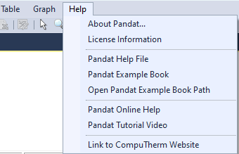 From the help menu as shown in Figure 2.2, the user can have access to many resources on how to use Pandat software, Including Pandat online help and Pandat Tutorial Video. Click the "Open Pandat Example Book path" will open the Pandat example book folder, in which collected all the files required to run all examples in the example book.