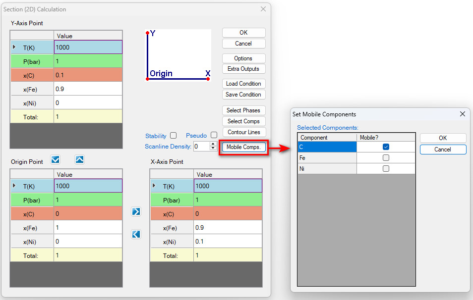 The calculation for a para-equilibrium follows the same procedure as the normal calculation except for setting the mobile components before calculation. In dialog window for all three calculations of Point (0D), Line (1D), and Section (2D), there is a button “Mobile Comps.” After clicking on this button, a new dialog window pops up for setting the mobile components. As shown below are the dialog windows for setting an isothermal section calculation for Fe-Ni-C system with C is mobile. The default state is that the all the components are immobile. When the element is set as “mobile comps”, After click “OK”, the mobile component will be shown as orange at the calculation condition setting interface, as shown in Figure 3.91. The calculated para-equilibrium isothermal section is shown in Figure 3.92.