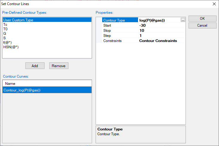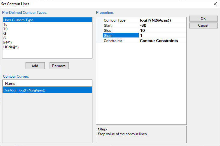 The following example shows how to calculate the contour lines for the partial pressure of the gas phase in the Ti-N system [1996Zen]. Figure 3.59 (a) is the input condition window and Figure 3.59(b) is the calculated phase diagram of Ti-N with the contour lines of log(P(N2@gas)) (pressure unit is Pa), which is the common logarithm of the partial pressure of N2 in gas. Figure 3.59(c) is another input condition window and Figure 3.59(d) is the calculated phase diagram of Ti-N with the contour lines of log(P(@gas)), which is the common logarithm of the total pressure of gas with the gas species N, N2, N3 and Ti.