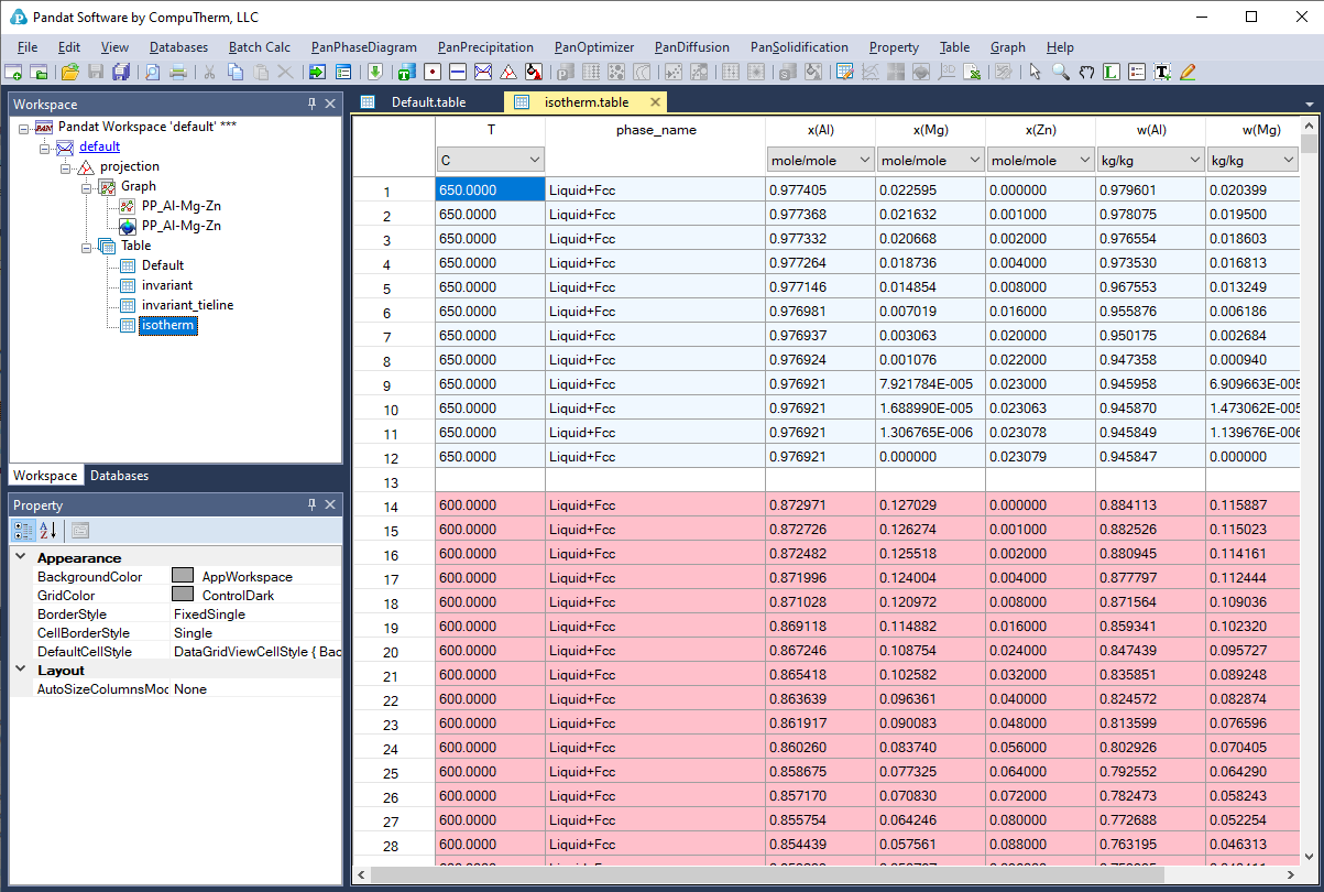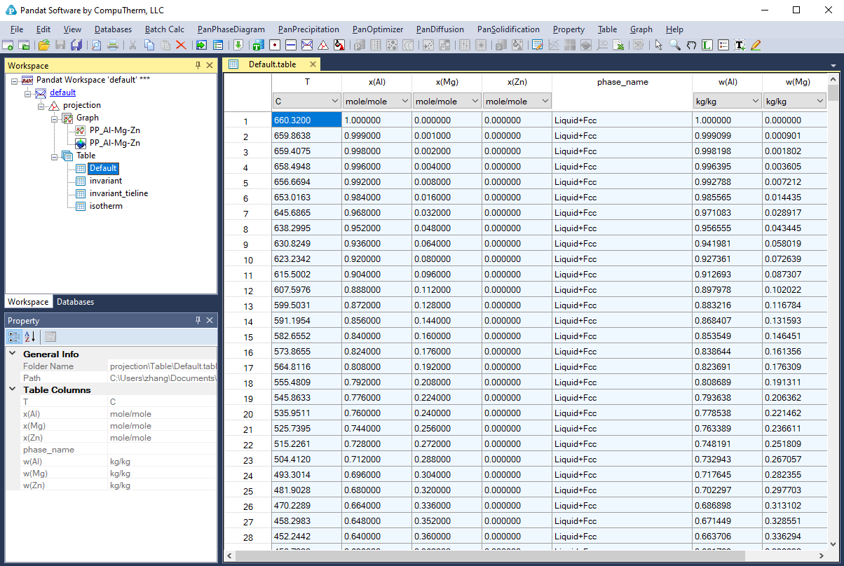The results from a liquidus projection calculation are displayed in two types of format in the Pandat main window: Graph and Table. Figure 3.61 and Figure 3.62 show the 2D and 3D graph view; Figure 3.63 and Figure 3.64 show the default table and isotherm table for the liquidus projection calculation results, respectively. User can switch between Graph view to Table View by double clicking on the graph name or the table name in the Pandat Workspace window. Extensive operations on Graph and Table, such as labeling and adding legend, have been discussed in detail in Section Graph and Section Tables.