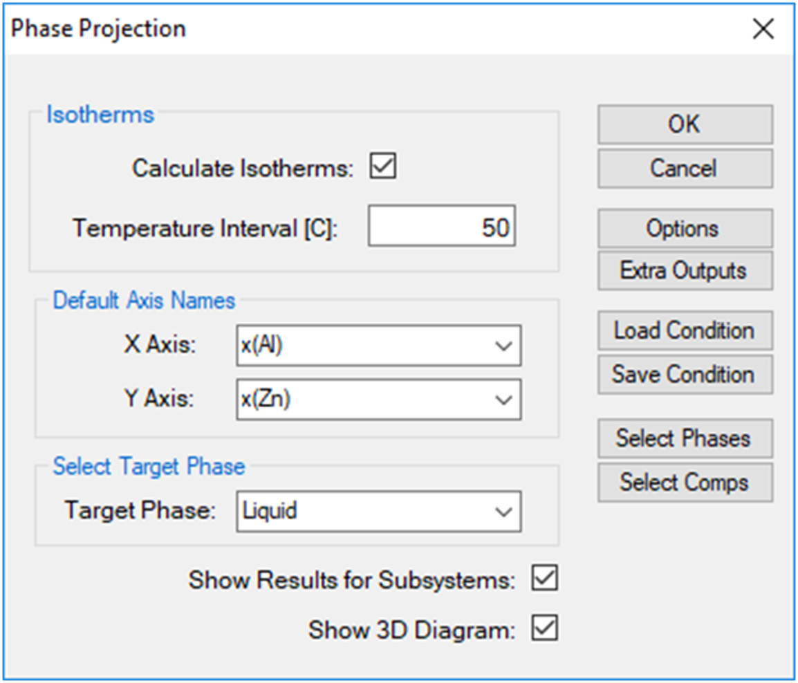 button on the tool bar. The Phase Projection dialog box shown in Figure 3.60 allows the user to calculate projection of any phase in the system. If “Liquid” is selected as Target Phase, liquidus projection for the system is calculated. Isothermal curves involving the selected phase in a ternary system can also be calculated by checking the box Calculate Isotherms. The density of isothermal curves depends on the scale of Temperature Interval. A larger value for the temperature interval leads to fewer isothermal curves but with faster speed of calculation. The default Compositional Range is full range for each component. User can define the default output graph by selecting the X and Y axis. User can also access the Options, Extra Outputs, Load Condition, Save Condition, Select Phases, and Select Comps windows through this dialog box. If the Show Results for Subsystems box is checked, the output files will include the results for the subsystems together with the multicomponent system. Be aware that the output table will be huge if the box is checked for a calculation with a higher order multi-component system. User can choose the specific phase for projection calculation in the Target Phase dialog, such as Fcc phase. If “*” is selected, the projection for all the phases will be calculated. If the Show 3D Diagram box is checked, there will be an extra 3D diagram showing the calculation results as well as the original 2D diagram. For the 3D diagram, user can rotate the diagram by holding the left button of mouse and move it around.