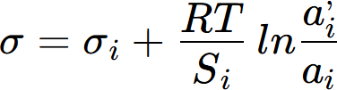 where σi, a'i and ai are the surface tension, activity at the surface and activity in the bulk of component i. And Si is the surface monolayer area,