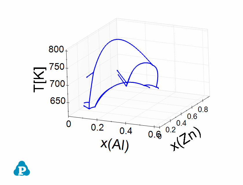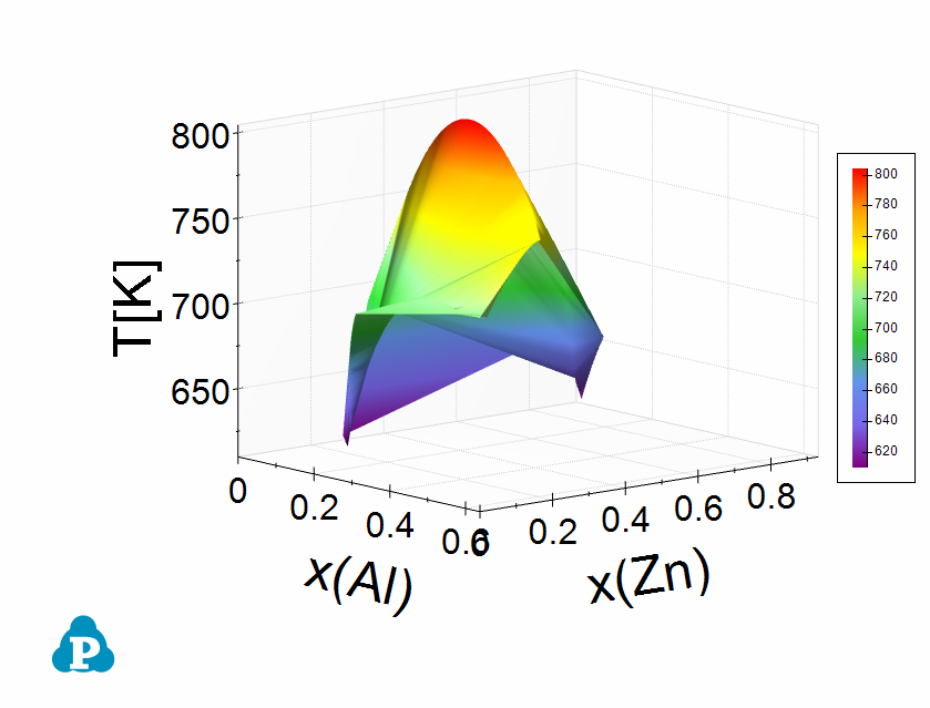 In Pandat software, you can not only plot typical 2D phase diagrams (Plot diagrams from table in Table Operation in Pandat), but also some 3D line graphs, surface graphs and color map graphs.
