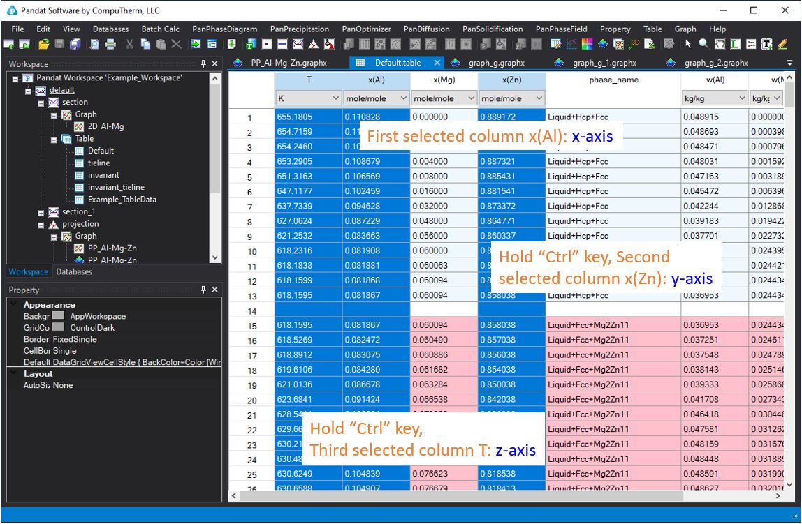 You can plot 3D phase diagram or color map graphs from any table or HTC result report table. The first click select column is set as x-axis, then hold the “Ctrl” key on the keyboard, the second selected column is set as Y-axis, keep holding the “Ctrl” key, the last selected column is the Z-axis in 3D graphs. Please note that the X, Y, Z axis is determined by the sequence of the selection, not related to the position of the columns in the table.