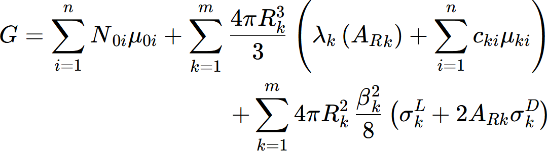 The first term is the chemical part of the Gibbs energy of the matrix, the second term corresponds to the stored elastic energy and the chemical part of the Gibbs energy of the precipitates and the third term represents the total precipitate/matrix interface energy. The subscripts ‘‘0” denote quantities related to the matrix, e.g., N0i is the number of moles of component i in the matrix and μ0i is chemical potential in the matrix. The quantity λkAR accounts for the contribution of elastic strain energy due to the volume misfit between the precipitate and the matrix and is calculated from Eq. 5.6. μki are the values of chemical potentials in the precipitates corresponding to cki. In the model, there are two interface energies that must be assigned: