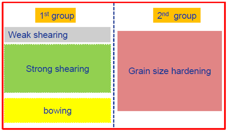 As an example shown in Figure 5.4, the first group has three mechanisms “weak shearing”, “strong shearing” and “bowing” while the second group has only one mechanism. This is very typical in the γ' strengthened Ni-based superalloys. The big primary γ' acts to limit grain growth during solution treatment and enhances grain boundary strengthening while the tertiary/secondary γ' particles strengthen materials through the weak/strong shearing and bowing mechanisms. In [2015Gal], Galindo-Nava proposed a unified model for weak/strong shearing and bowing mechanisms. The transitions from weak to strong shearing and to bowing are automatically taken care. The unified critical resolved shear stress τshearing is calculated as,
