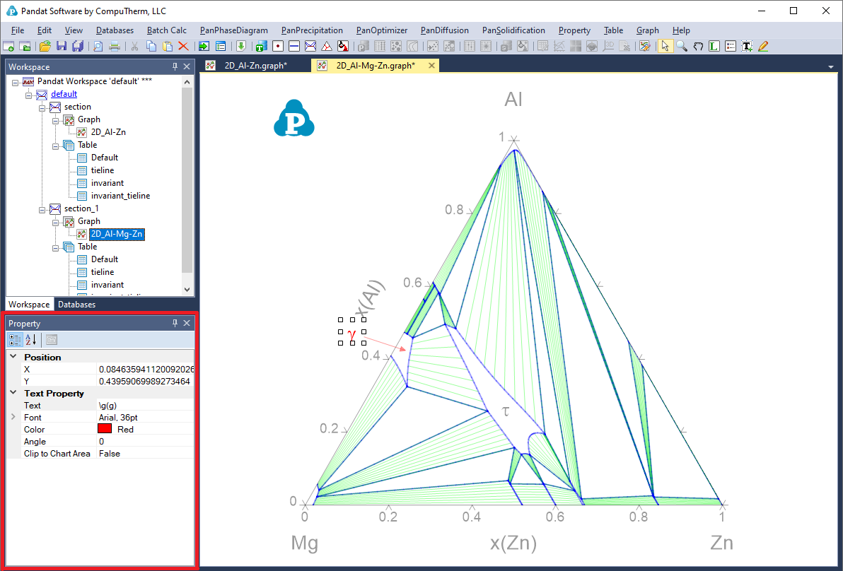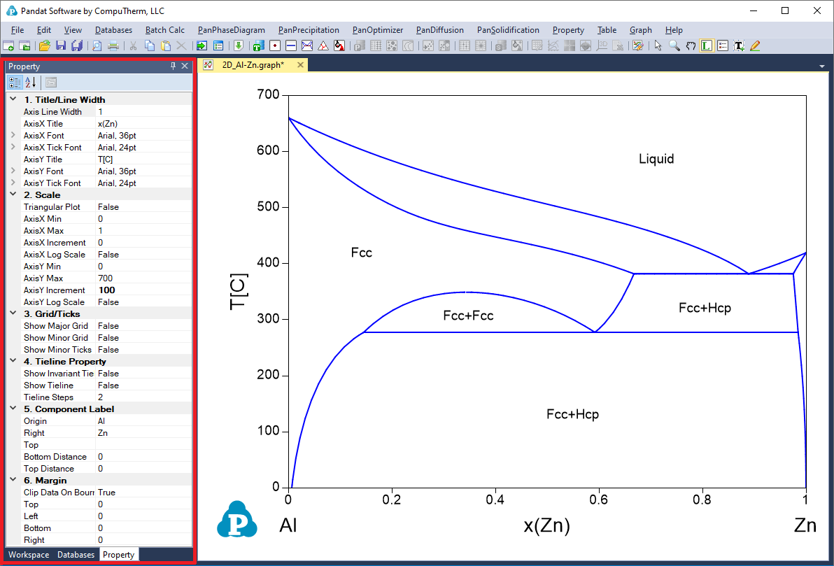 The overall property of a graph consists of six categories: Title/Line Width, Scale, Grid/Ticks, Tieline Property, Component Label and Margin, as shown in the red box area in Figure 2.7 All six categories will be shown in “Property” window when the whole graph is selected. The “Title” property defines the axis line width, the title, title font size and tick font size for both X axis and Y axis. The “Scale” property defines the minimum and maximum values, increment and Log scale status for both X and Y axises and a flag of “Ternary Plot”. If this flag is set as “True”, the figure is plotted as Gibbs triangle for a normal isothermal section and only the increments are also shown in the Scale property. If the flag is set as “False”, a Cartesian coordinate figure will be plotted. The “Grid/Ticks” property defines whether to show grids on the graph or ticks on the axis. The “Tieline” Property defines whether to show the tie-lines and the density of the tie-lines. The “Component label” defines the labels on the origin, right corner and Top corner of the graph. The “Margin” property defines the position of the plot in the Main display window.