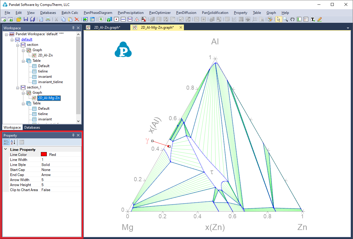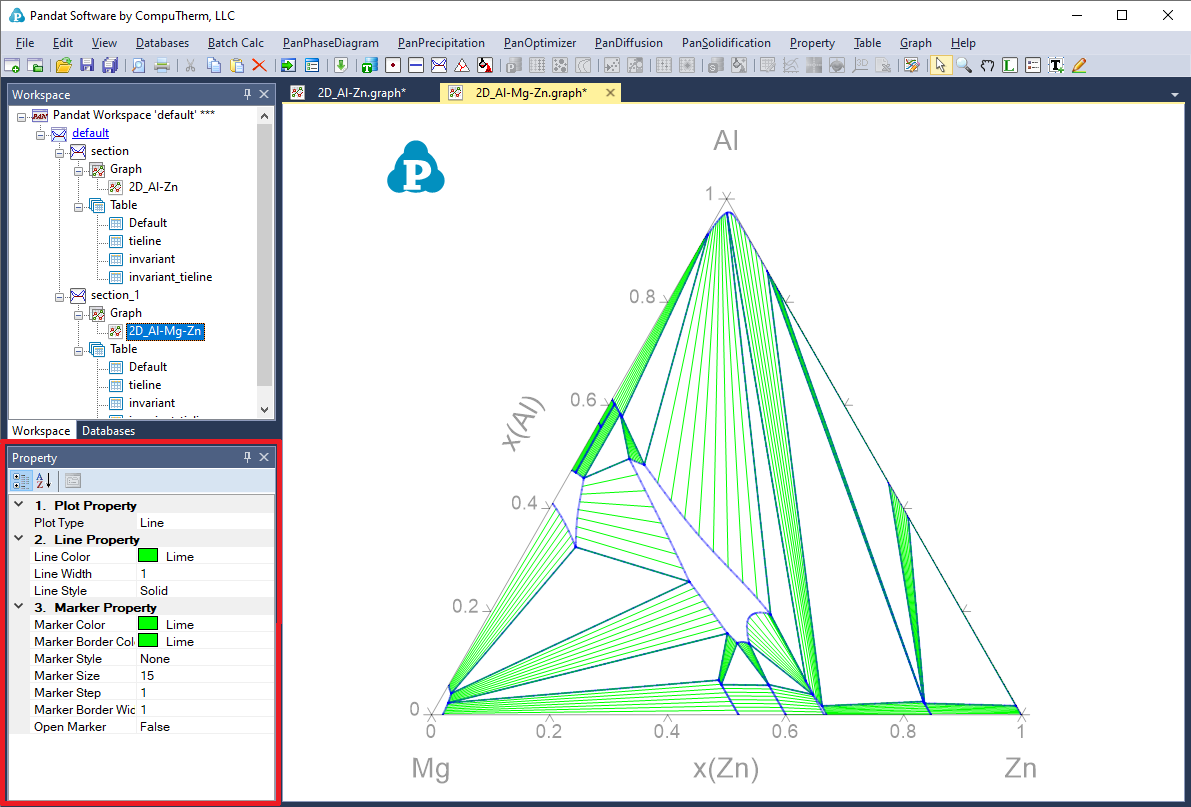 The other properties of the tie-lines, such as the color, the style, are defined by individual property window associated with these tie-lines. These properties can be modified when only the tie-lines on the Main Display window are selected and highlighted as shown in Figure 2.8 . User can change the appearance of a set of lines belonging to the same group by selecting this line (or a group lines) only. The properties for such data plots, such as the line color, thickness, marker type, will show up in the Property window for user to modify. The data points and lines selected will be highlighted in the graph while the others will be grey. As shown in Figure 2.9 , the phase boundary lines are selected as a group of lines to be modified in this case. The properties of this group lines are defined in the “Plot Property” window as “Blue, Solid, None marker” lines. All these properties can be modified in the Property Window as framed by the red line in Figure 2.10. The “Line Property” defines the property of the line and the “Marker Property” defines the property of the point on the graph.
