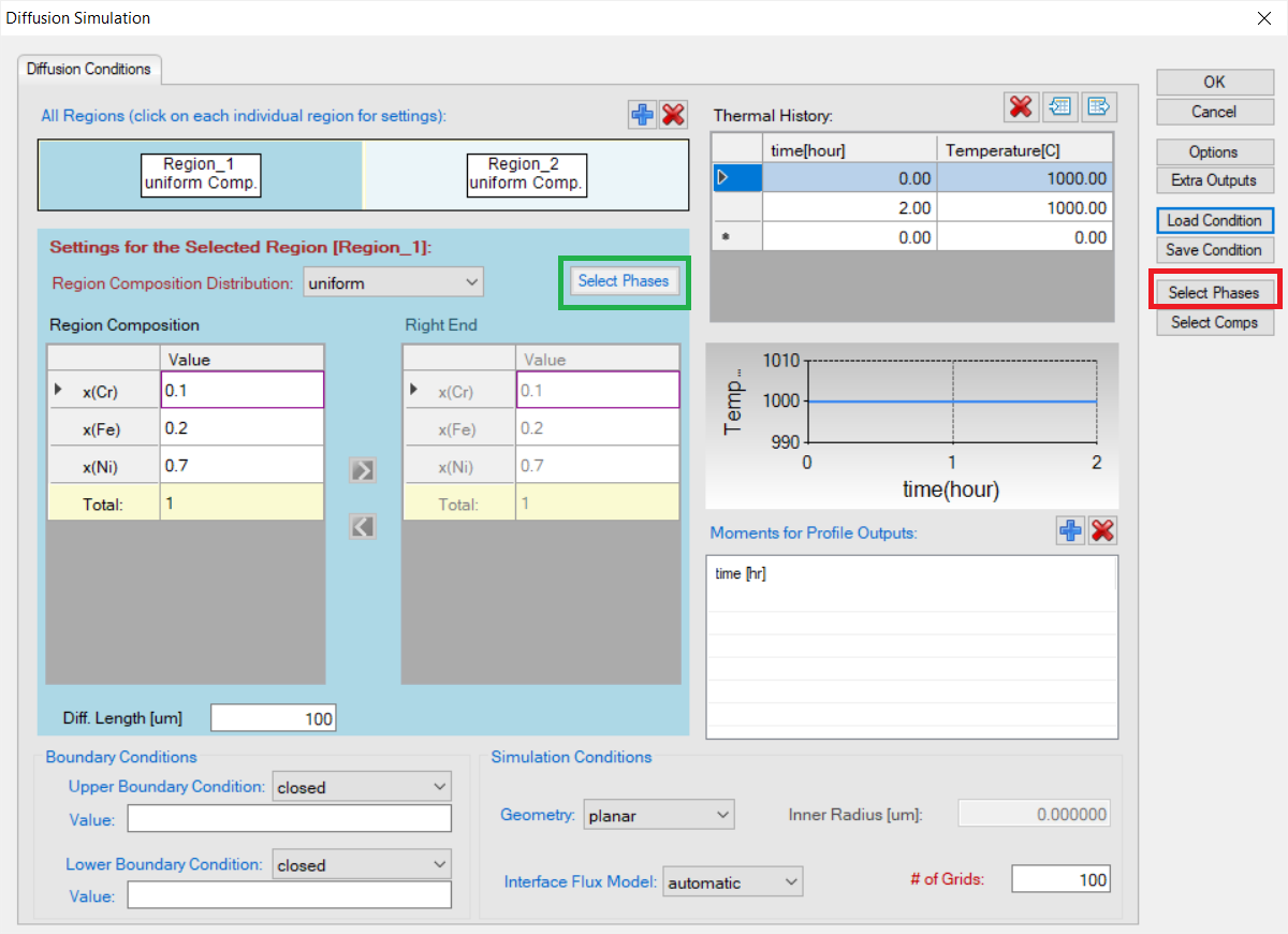 By clicking “Select Phases” as highlighted by the red box in Figure 6.6 user can select phases involved in the diffusion simulation on the system level. By default, all the phases in the alloy system are selected, while user can deselect some of them as wishes. In addition, user can also select phases for each region by clicking “Select Phases” as highlighted by the green box in Figure 6.6 By default, phase selection for each region follows the global setting in the system level.
