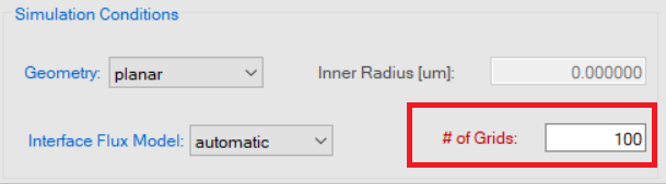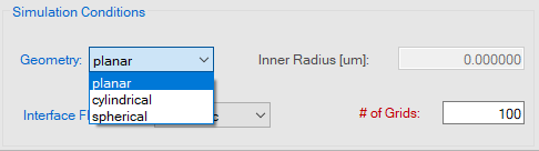 In the GUI of PanDiffusion, “Geometry” under “Simulation Conditions” decides the shape of inter-grid interface. By default, “planar” is used for most diffusion couple simulations. When particle homogenization or transformation is performed,Figure 6.15 “spherical” or “cylindrical” could be selected depending on the problem of interest.