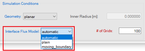 In the GUI of PanDiffusion, “Interface Flux Model” under “Simulation Conditions” decides how the grid composition evolves at the interface between different phases. The option “automatic” is selected by default, which chooses the interface flux model automatically based on the number of phases selected in each region. When “plain” is selected, the mobility of the solute elements is determined by the weighted average of the mobilities of the individual phases occurring in a grid point (See the Section Set Effective Mobility (Advanced option)). Figure 6.17 When "moving_boundary" is selected, a sharp interface model is used to calculated the flux across the phase boundary which does not require the effective mobility.