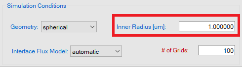 When geometry other than “planar” is selected, user can set inner radius of cell, to simulate for a tube or shell geometry. When “cylindrical” geometry is selected, and the inner radius is non-zero, tube geometry is set up.Figure 6.16 When “spherical” geometry is selected, and the inner radius is non-zero, shell geometry is set up.