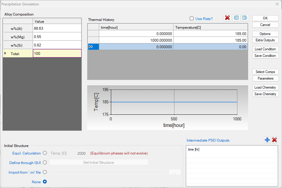 - Click on the menu "PanEvolution/PanPrecipitation → Precipitation Simulation", and set up the calculation condition as shown in Figure 3.4.2. Note the alloy composition is wt% (click Option button to select the unit);