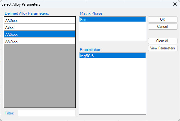- Click on PanEvolution/PanPrecipitation on the menu bar and select "Load KDB or EKDB", then select the Al_Alloy.kdb; the pop-out window is shown in Figure 3.4.1 which include the alloy name, the matrix phase and the precipitate phase, and select the AA6xxx alloy in the "Define Alloy Parameters" column;