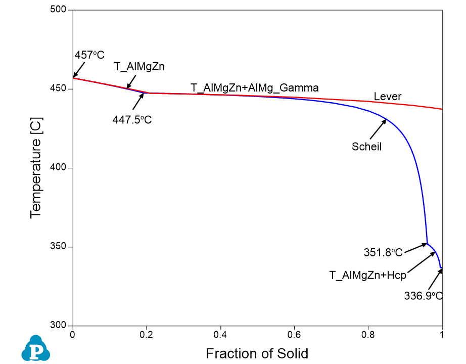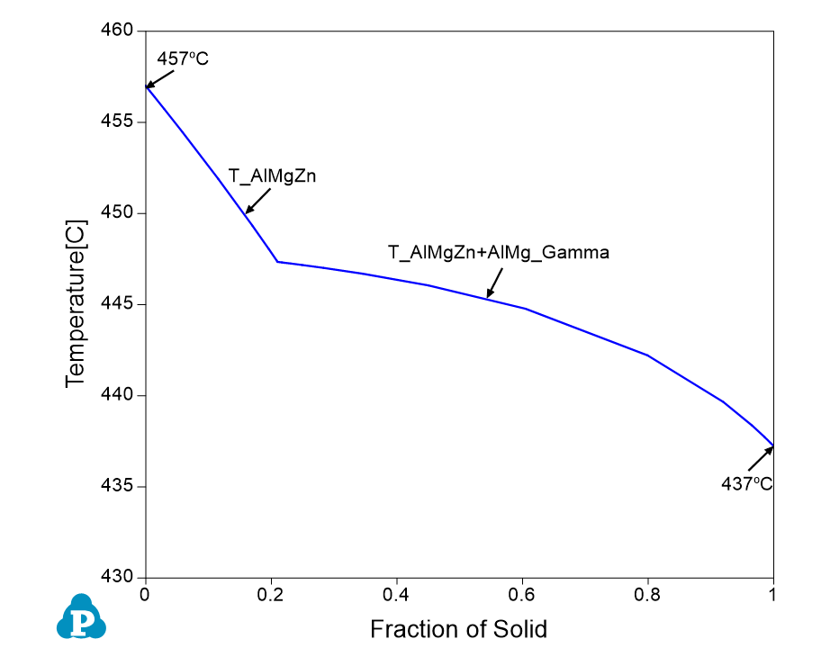 - Figure 1.8.2 shows the fraction of solid as a function of temperature from Scheil simulation. Solidification starts at 457°C and ends at 336.9°C, the freezing range is 120.1°C;