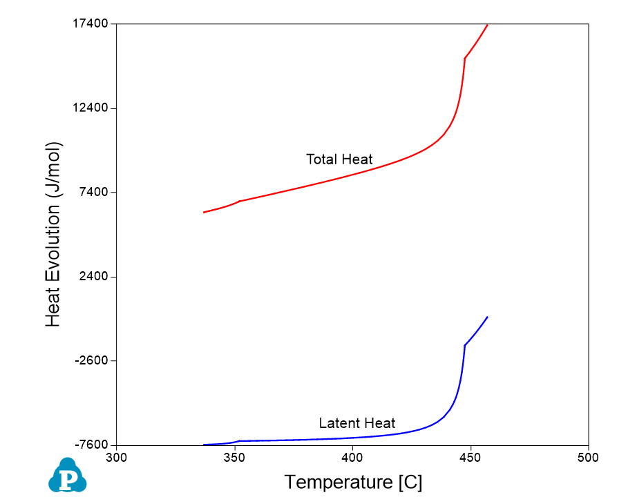 - Certain properties can be selected from the Default table and plotted. Figure 1.8.4 shows the fraction of each solid phase as a function of temperature, and Figure 1.8.5 shows the Latent heat and total heat evolution as a function of temperature;