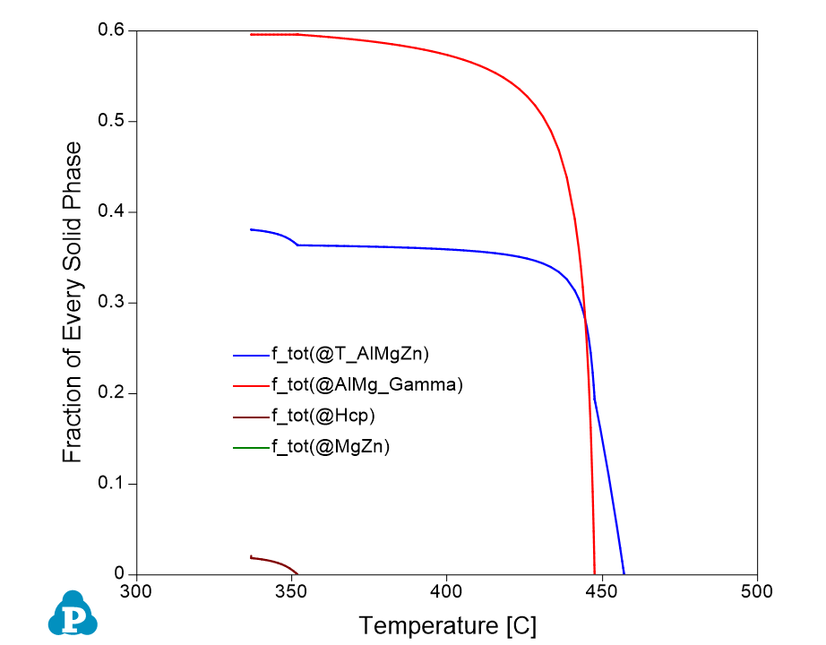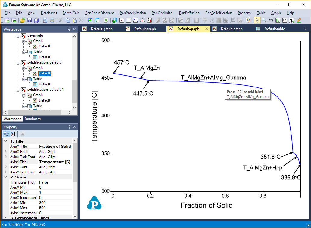 - The primary solidified phase is T_AlMgZn phase, AlMg_Gamma starts to solidify at 447.5°C and Hcp starts to solidify at 351.8°C. Put the cursor on the line segment, a tool tip will pop out showing the phase(s) solidified in that composition and temperature range (Figure 1.8.2). Press ‘F2’ to label it;