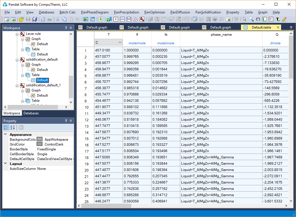 - Detail information for the simulation, such as solidification start temperature for a certain phase, the total fraction of each solid at different temperatures, latent heat, and total heat evolved can be found in the Default Table as shown in Figure 1.8.3;