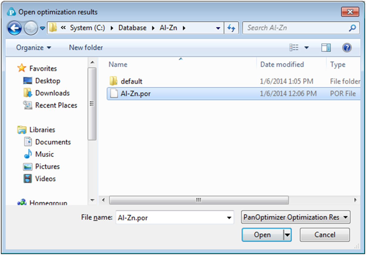 Figure 4.10: Dialog window of open the saved optimization results