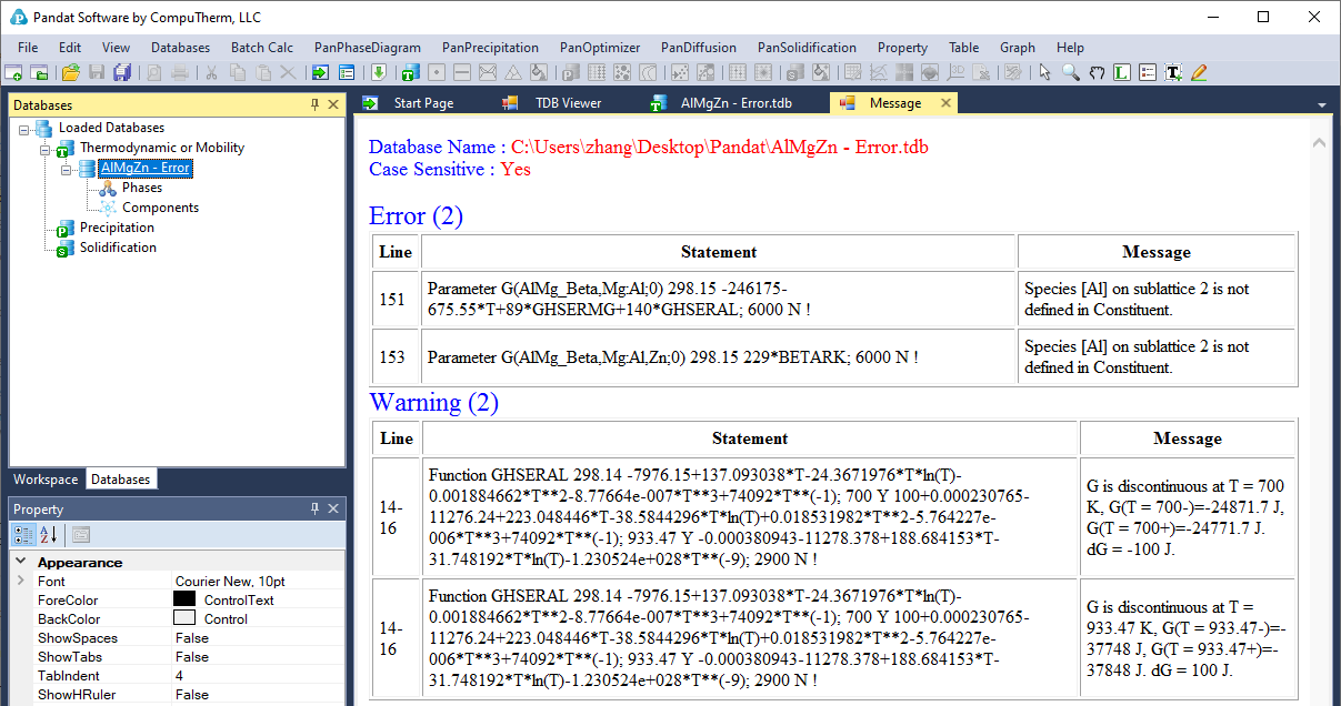 While loading a database file, Pandat checks the self-consistency of the database. A message will be displayed if the database is not internally consistent such as duplicated definitions of a function and missing definition of components or species in a sublattice. There are two types of messages: Error and Warning, as shown in Figure 3.4. The warning message can be ignored but the errors must be fixed, otherwise the database cannot be loaded. It is recommended to correct both error and warning before performing calculation. If you have difficulties loading a particular TDB or PDB file, please contact CompuTherm, LLC, and we will help resolve the problem.