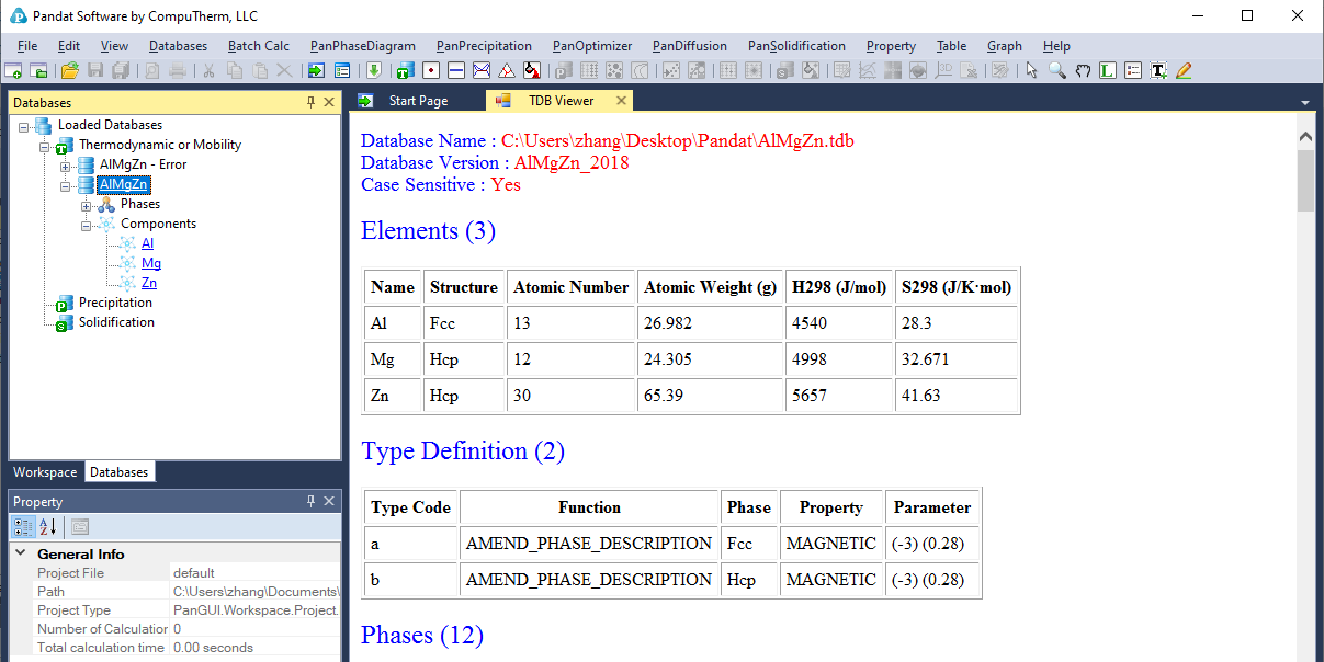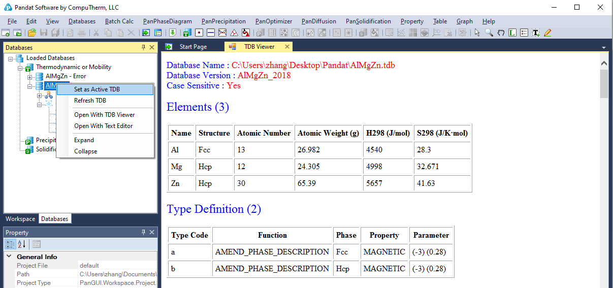 The successfully loaded database will be automatically summarized in the TDB Viewer mode in the main Display window as shown in Figure 3.5. For a TDB format database, the summary includes elements, type definitions, phases with name and thermodynamic model, model parameters and defined functions. For a PDB format database, the model parameters and functions will not be displayed. The user can open a TDB format database with the Text Editor mode by right click of the mouse on the database name in the explorer window. The Text Editor is actually a built-in notepad for text files. User can use the Text Editor directly within Pandat workspace to edit the TDB database, or he/she can always use his/her favorite text editor to do it.