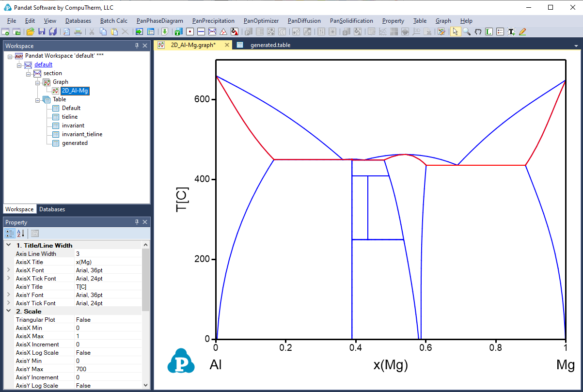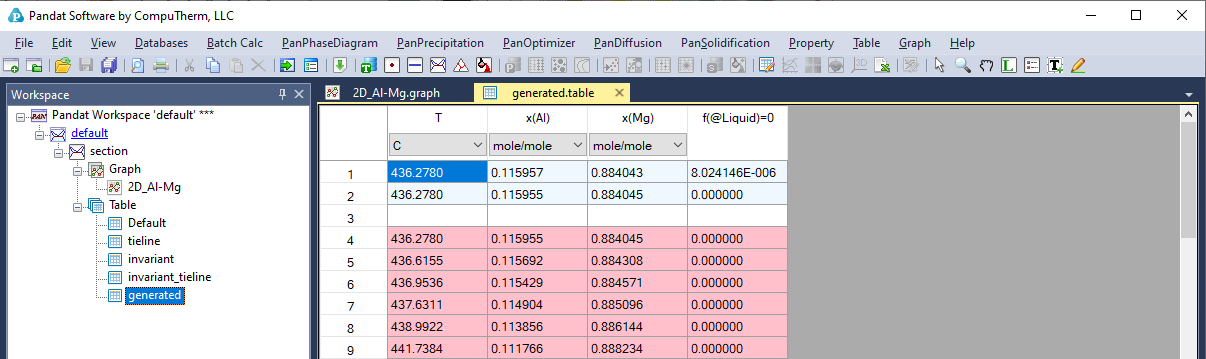 Here an example is given to demonstrate how to use the logical expression to obtain useful information from the calculated results. Figure 2.28 shows the calculated Al-Mg binary phase diagram. After the calculation, a table is generated with the constraint of f(@Liquid)=0, as seen in Figure 2.29. The new generated table is shown in Figure 2.30, which is a subset of the phase boundaries of Al-Mg where liquid phase exists and has phase fraction of zero, the so-call “first melting” boundary. This set of boundaries can be plotted on the Al-Mg phase diagram following the approach inSection Icons for Graph on Toolbar. The first melting line is shown in red as in Figure 2.31. More examples will be presented in Section Table Column Functions.