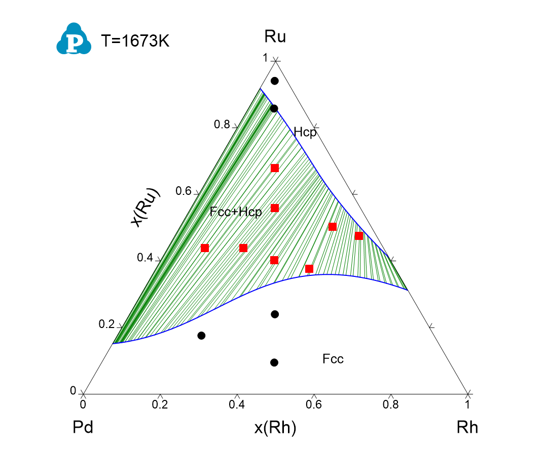 Figure 1.7: Calculated Pd-Rh-Ru isothermal section at 1673K and experimental data from ref. [1984Rae]