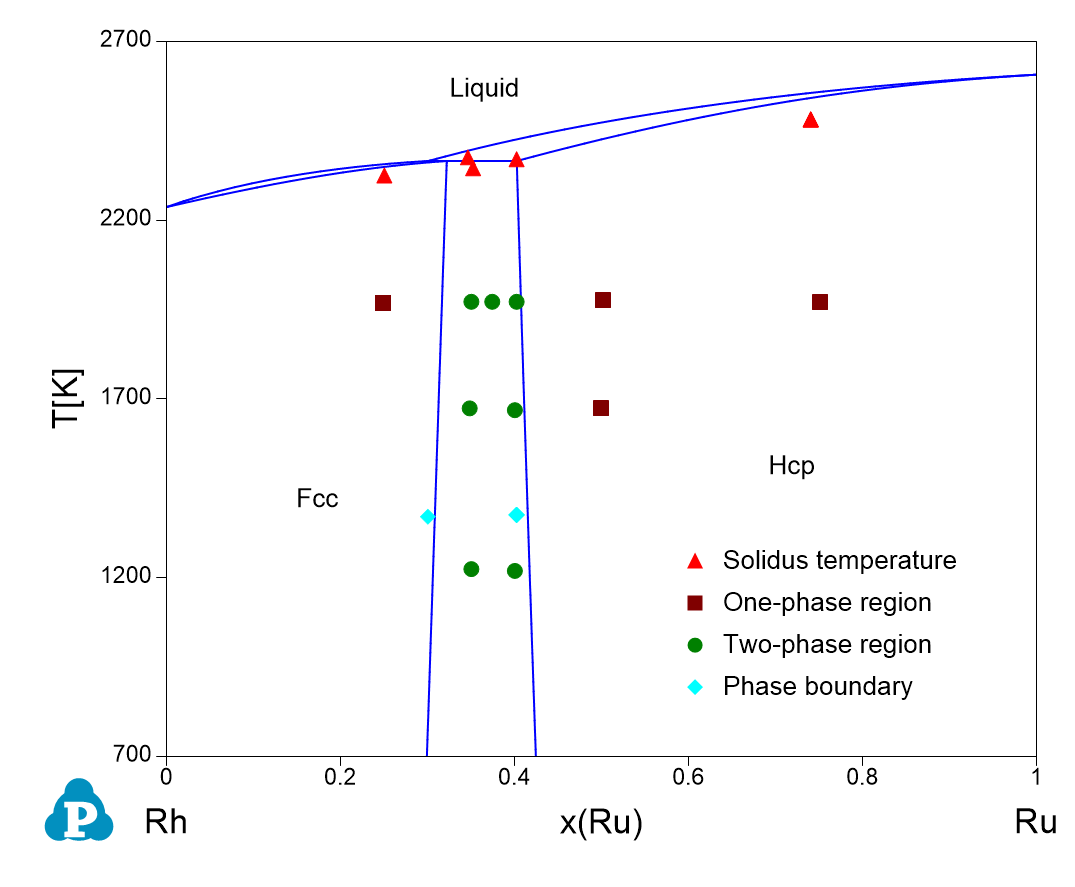 Figure 1.6: Calculated Rh-Ru phase diagram and experimental data from ref. [2016Gos]