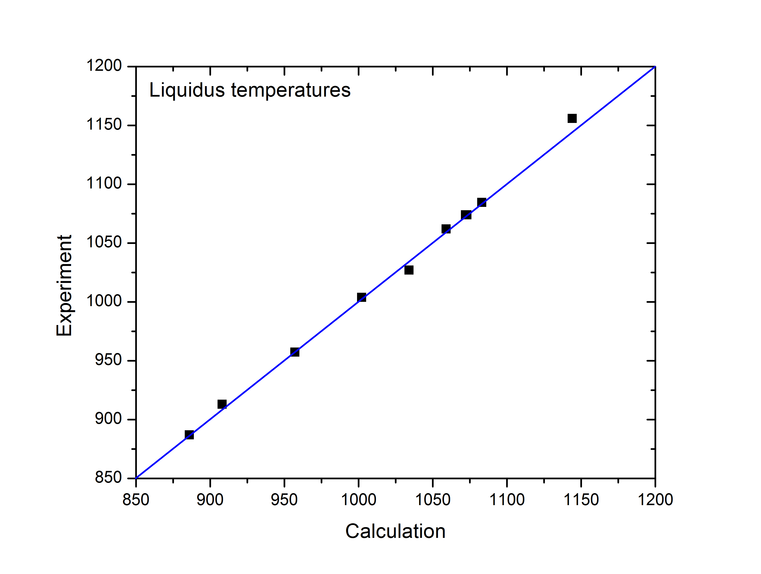 Figure 1.3: Comparison between the calculated and experimentally measured liquidus temperatures of [1982Bac]
