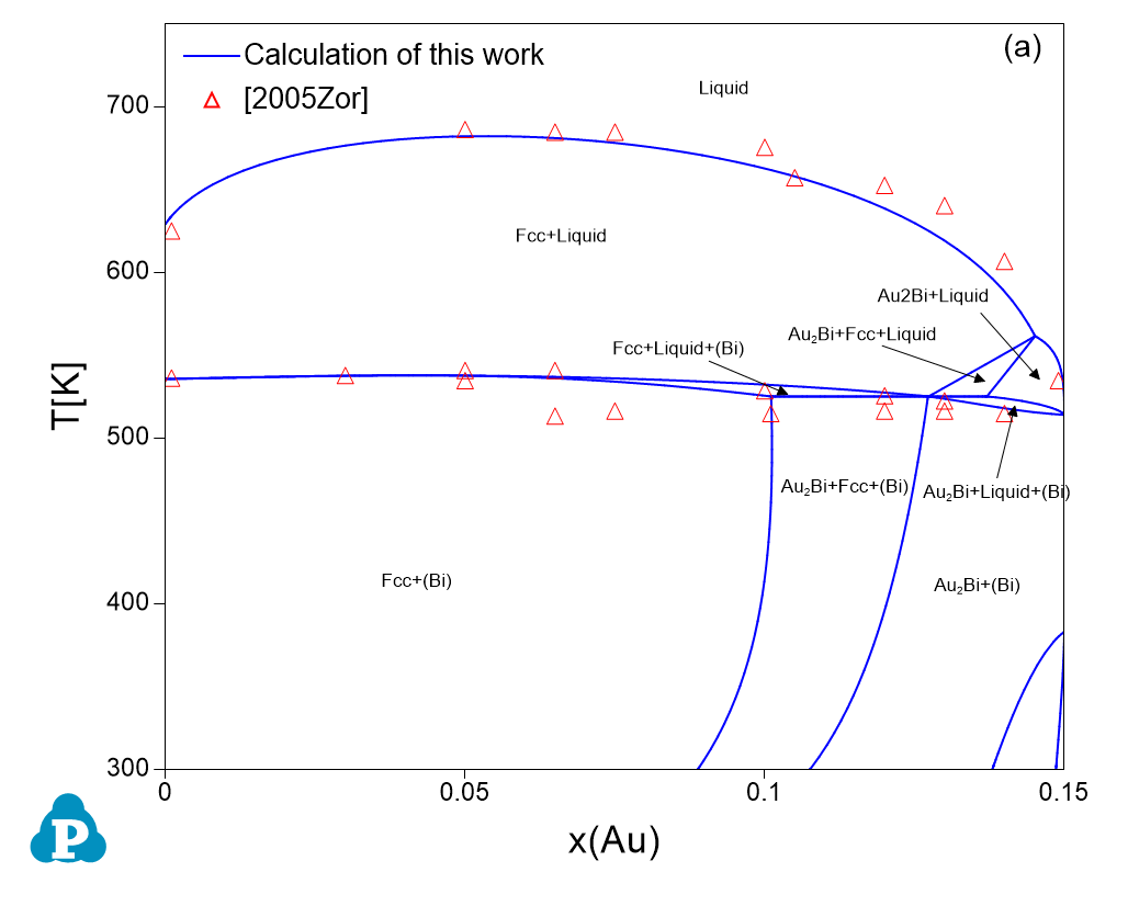 The current thermodynamic database can be used to calculate the phase diagrams not only for the noble-metal-rich systems (Ag-, Au-, Cu-, Ir-, Pd- and Pt-) but also other common alloying systems, such as Pb and/or Sn-rich solders. Extensive tests and validations have been carried out on the current thermodynamic database using the published experimental data in the literature. A few examples are given below. Figure 1.1 shows the Pt-Sn binary phase diagram with experimental phase boundary data plotted on it. Figure 1.2 shows two isoplethal sections in the of the Ag-Au-Bi ternary system: (a) Ag-Au-85 at.%Bi; (b) Au-Bi-20 at.%Ag. The experimentally measured phase boundary data are also plotted on them for comparison. Figure 1.3 shows comparison between the calculated and measured liquidus temperatures for some Cu-rich alloys.