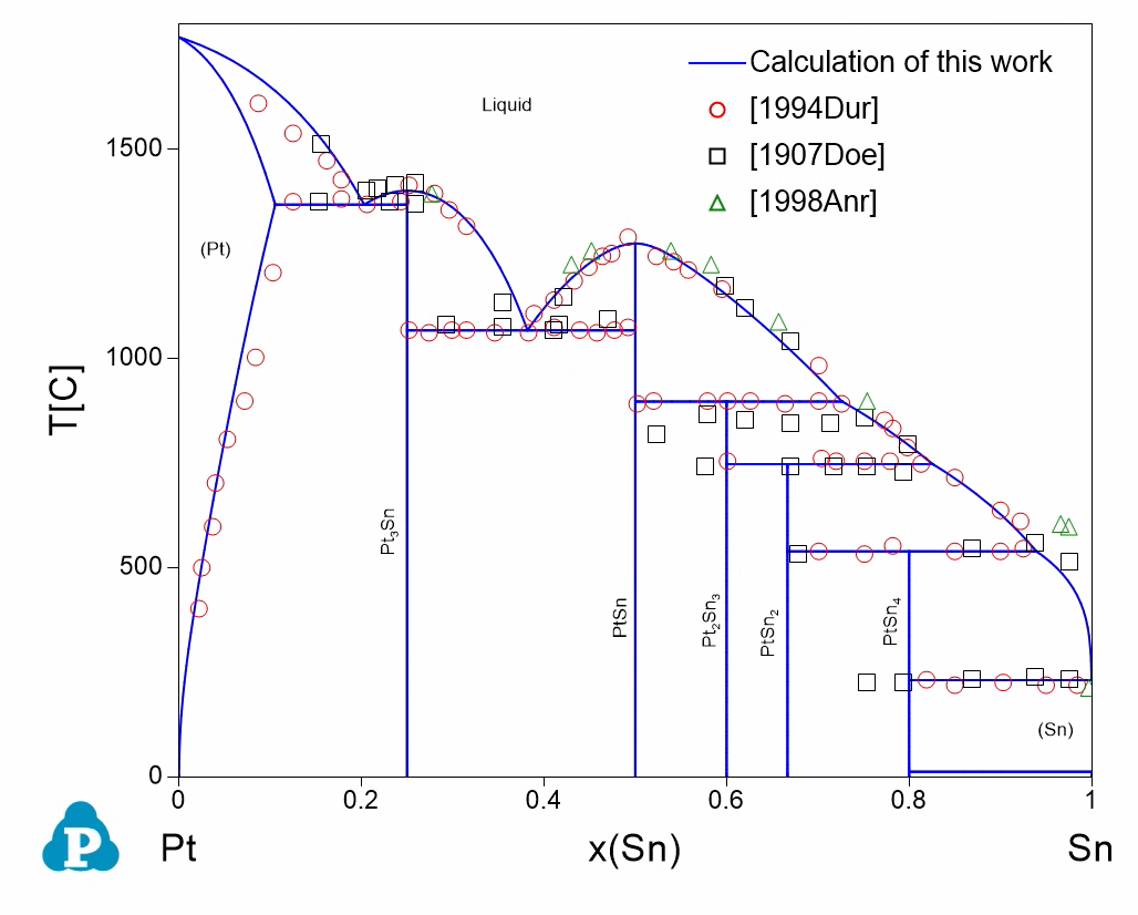 Figure 1.1: Comparison between the calculated Pt-Sn phase diagram with the experimental data