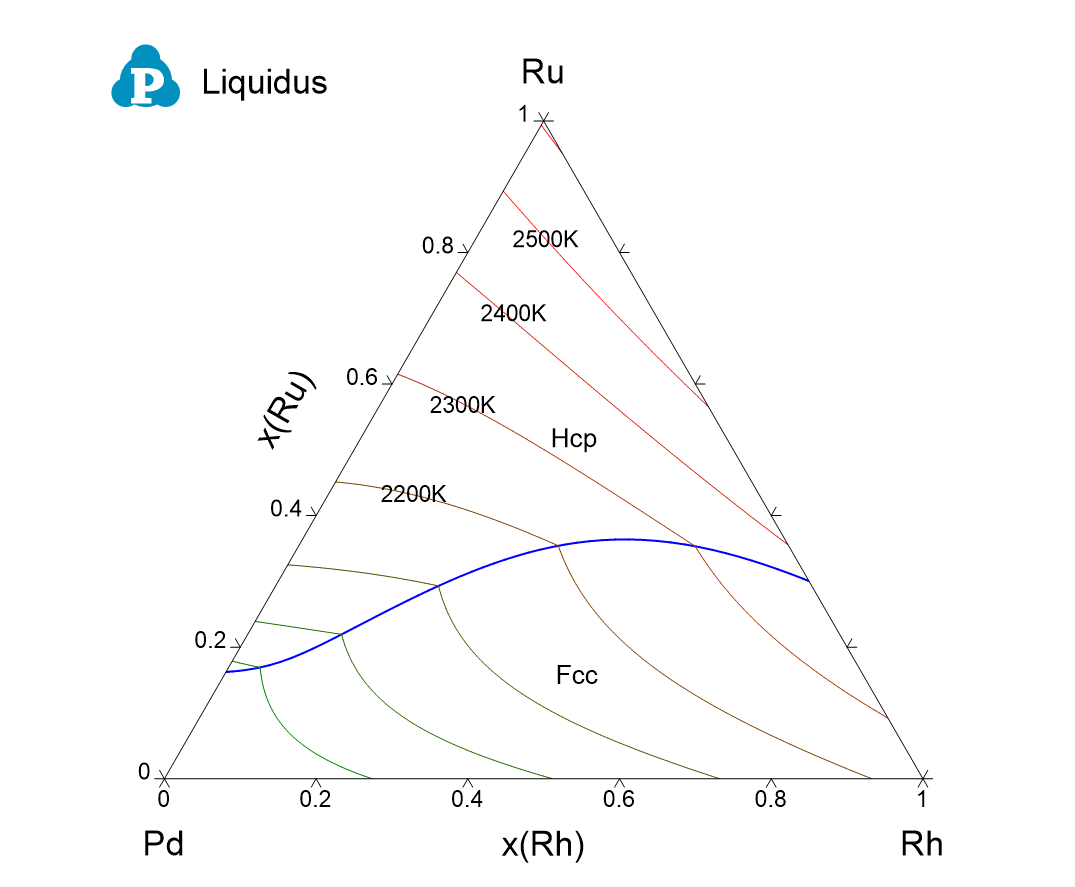 Figure 1.8: Calculated liquidus projection of the Pd-Rh-Ru ternary system