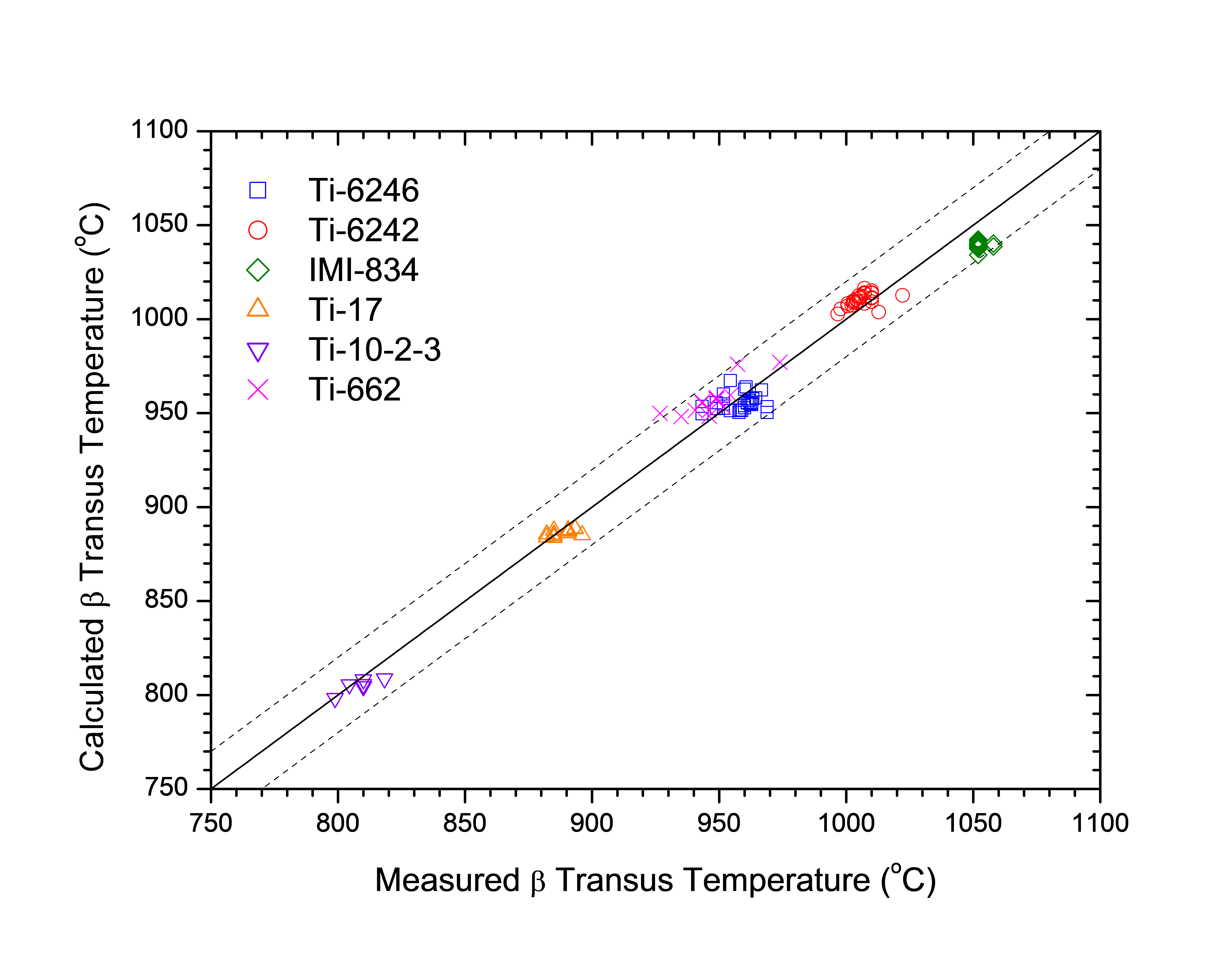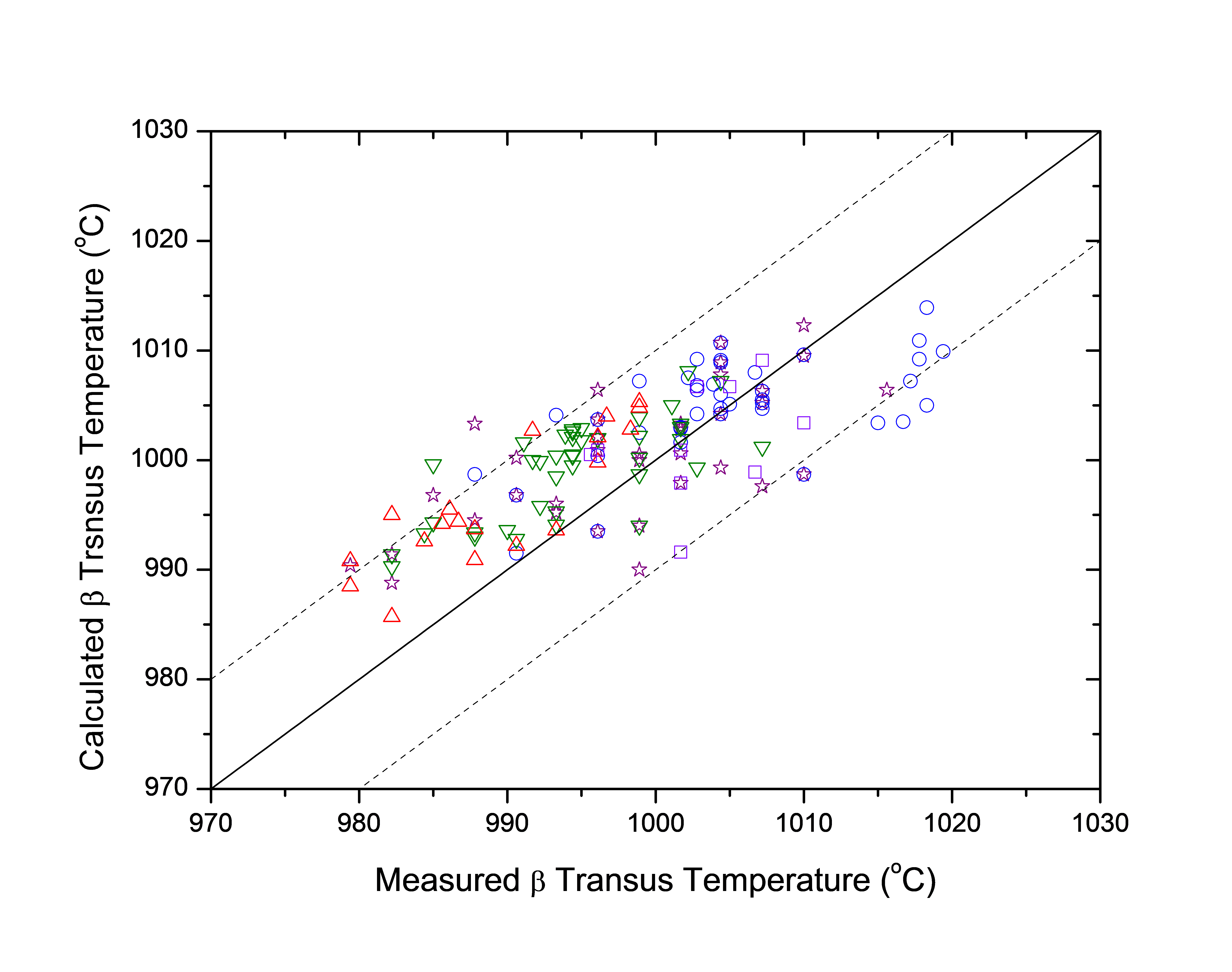 Beta transus, the temperature at which α starts to form from β, is an important reference parameter in the selection of processing conditions, such as heat treatment process, for the conventional α-β type of titanium alloys. This temperature has been calculated for a large number of Ti64 and other titanium alloys using the current database. Figure 1.1 shows a comparison between the predicted and observed beta transus temperatures for more than 150 Ti64 heats, reasonable agreement is obtained. The accuracy of the prediction depends on the reliability of the database and the accuracy of the input chemistry of the alloy. The calculated beta transus temperature is found to be very sensitive to the amount of the interstitial elements, such as C, H, N, and O. It is seen from Figure 1.1 that the predicted beta transus temperatures are in agreement with the observed ones. Figure 1.2 shows a similar comparison for other titanium alloys, including Ti662, Ti6242, Ti6246, Ti17 and so on, and reasonable agreement is obtained.