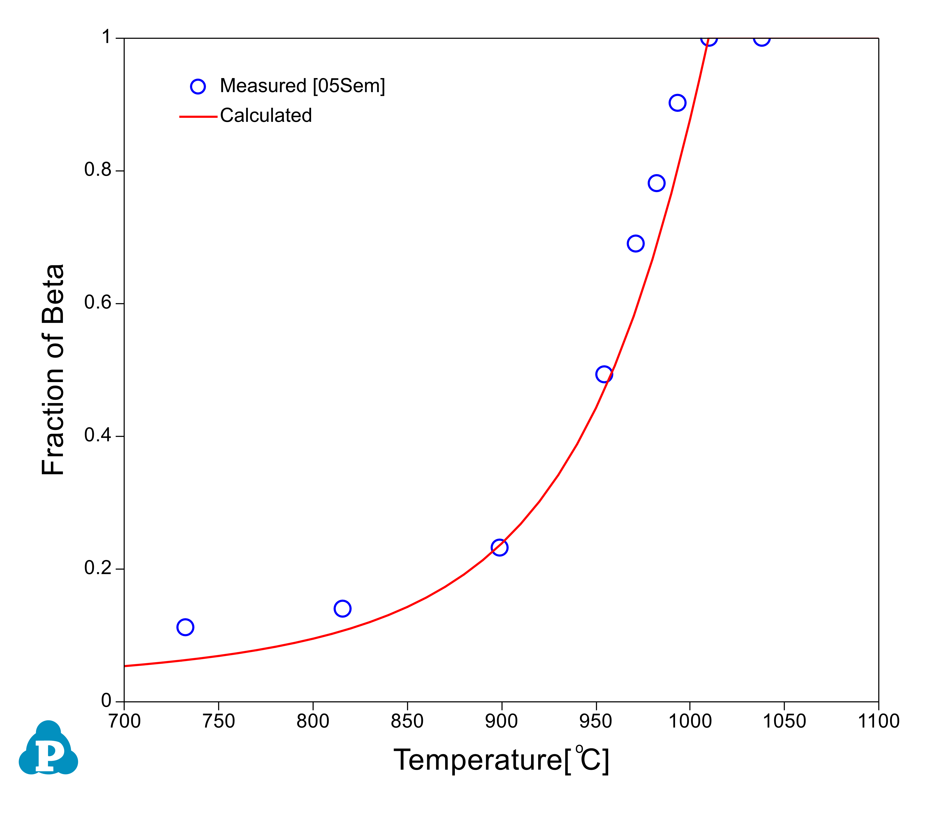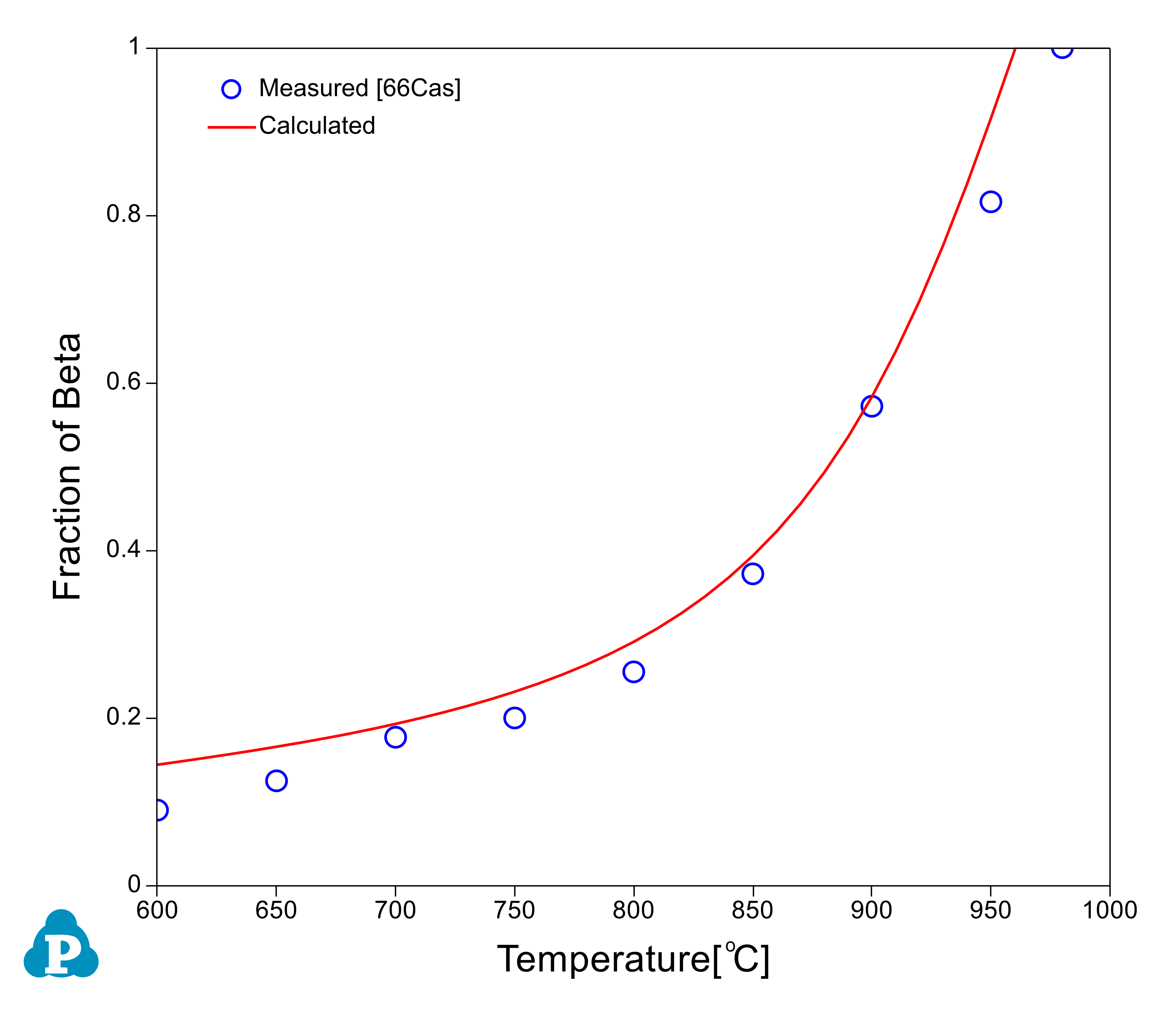 The relative amounts of α and β phases are critical in the determination of alloy properties for an α-β alloy. Beta approach curve, the volume fraction of beta phase as a function of temperature, is therefore important in the selection of final heat treatment temperature. Beta approach curves for two Ti64 heats are calculated as plotted in Figure 1.3 and Figure 1.4. The experimental data [2003Sem, 1966Cas] are also plotted on the diagrams for comparison; very good agreements are obtained.