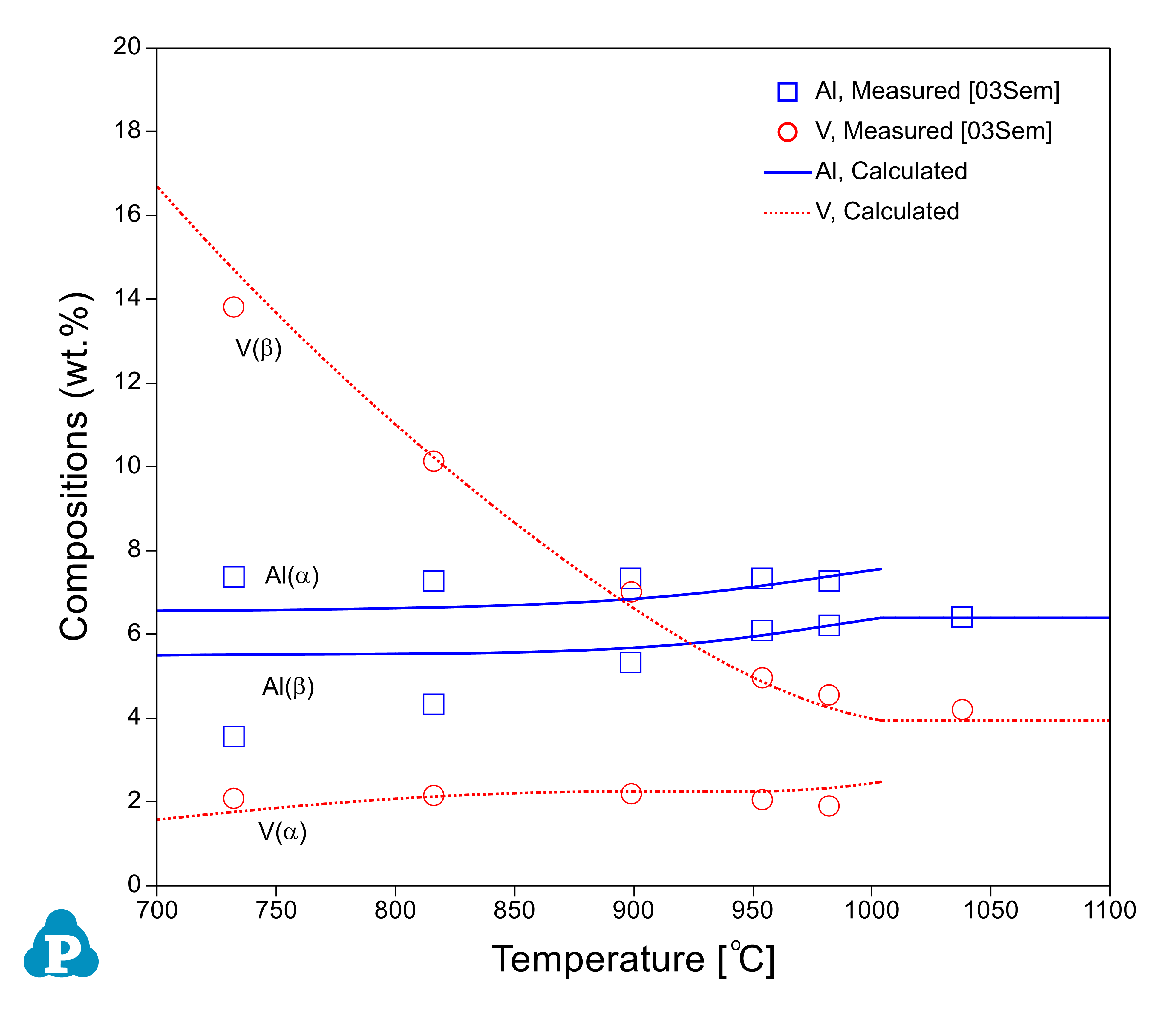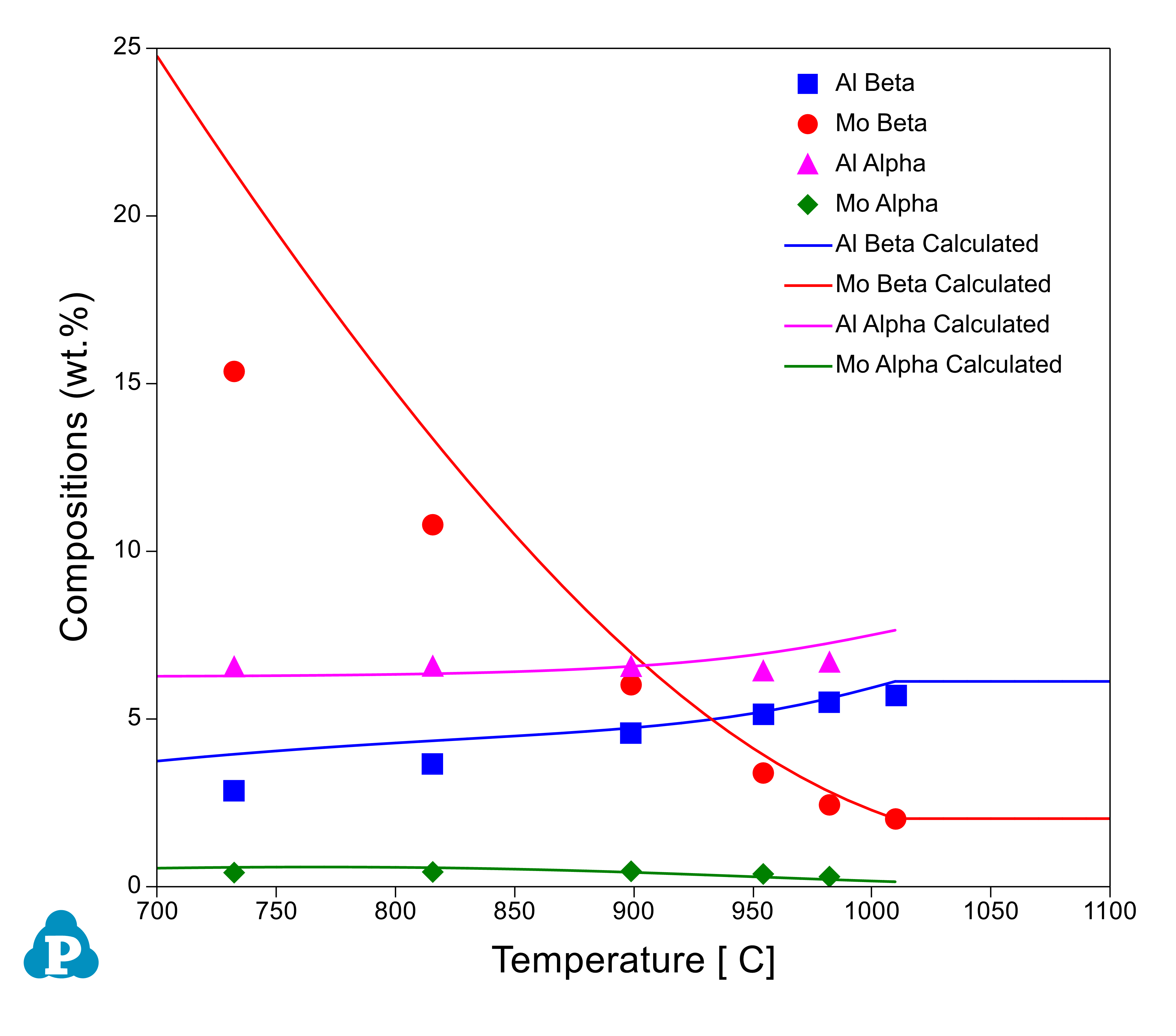 This database can be used to calculate phase equilibria for multi-component alloys, such as equilibrium between α and β. It can be used to predict phase transformation temperatures, such as β-transus. The fraction of each phase as a function of temperature, partitioning of components in different phases can also be calculated. In addition to equilibrium calculations, Scheil simulations can also be carried out using this database. Some calculated examples are given below.