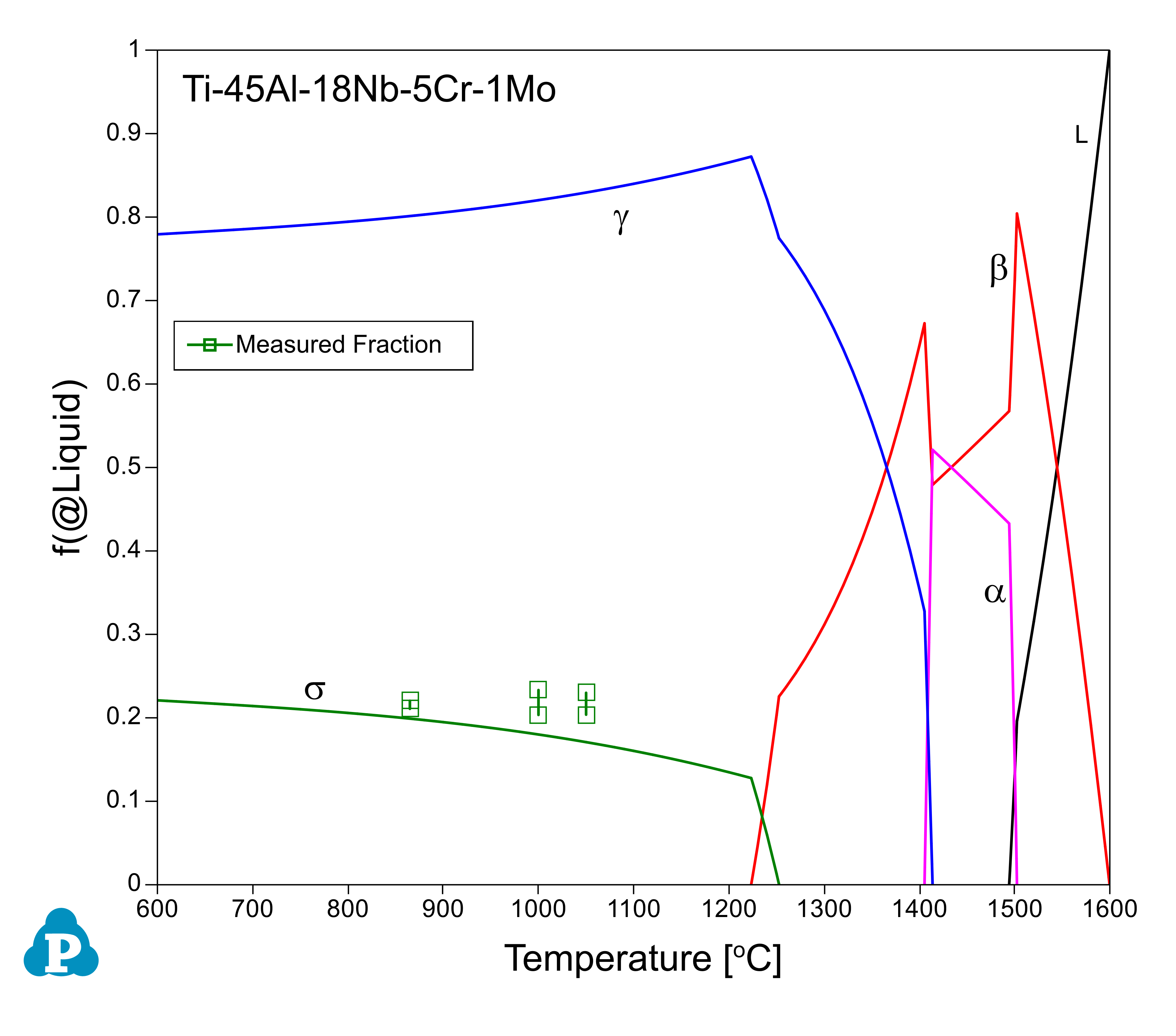 Figure 1.4: Calculated phase fractions for alloy Ti-45Al-18Nb-5Cr-1Mo (in at.%) compared with experimental data [2011Kes]
