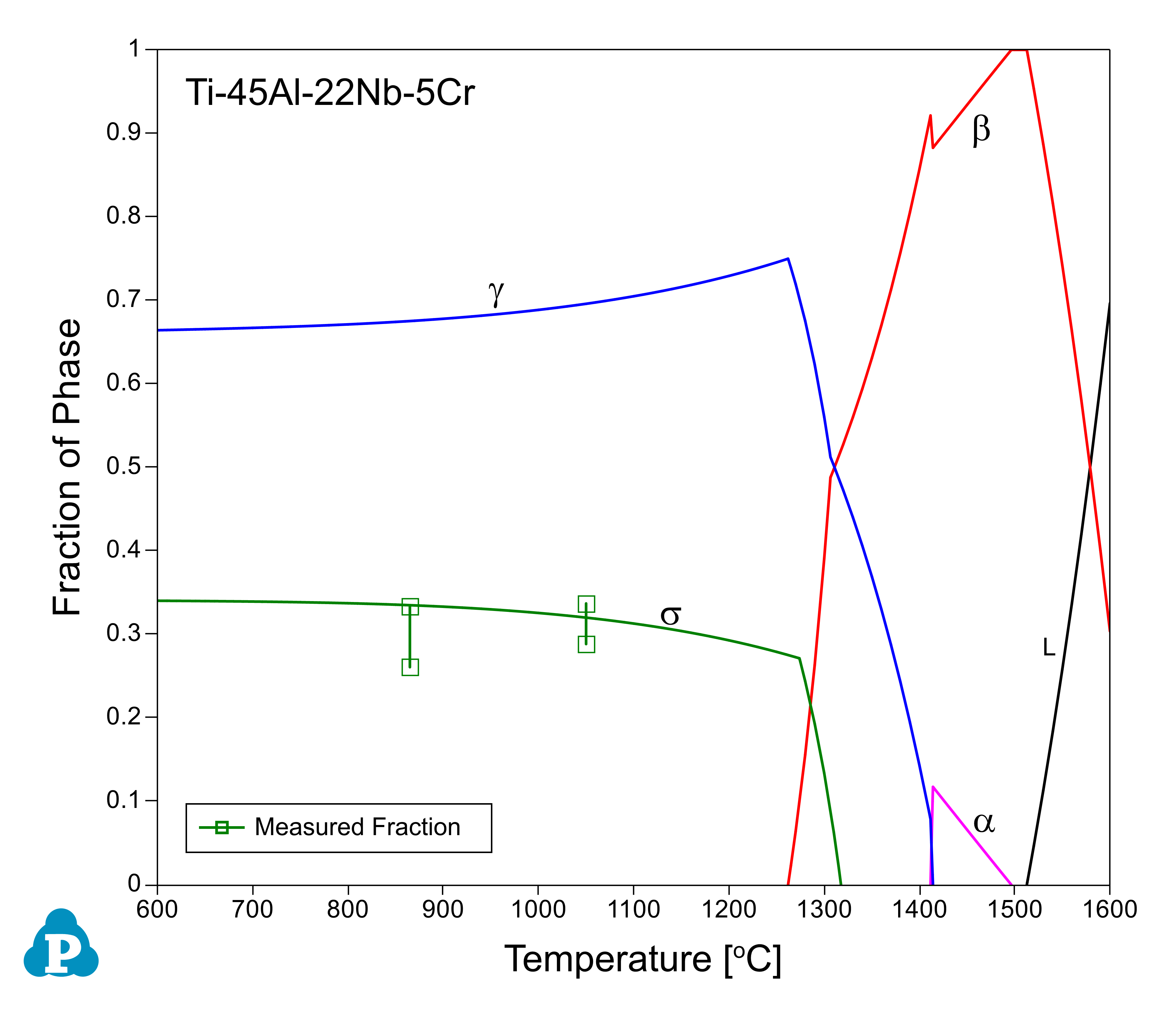 Figure 1.3: Calculated phase fractions for alloy Ti-45Al-22Nb-5Cr (in at.%) compared with experimental data [2011Kes]