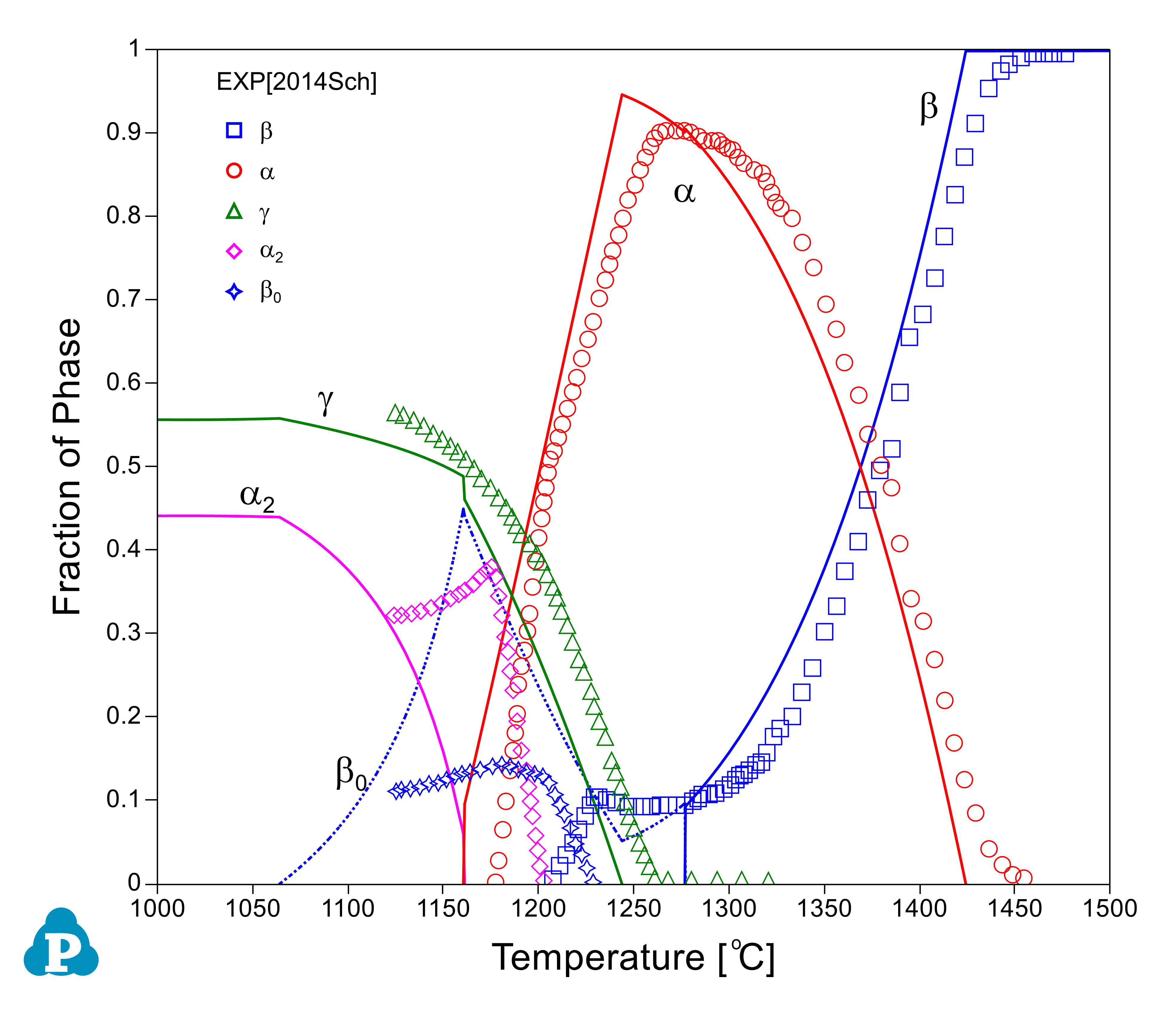 Figure 1.2: Calculated phase fractions for alloy Ti-43Al-4Nb-1Mo-0.1B (in at.%) compared with experimental data [2014Sch]