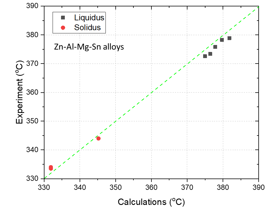 Figure 1.2: The comparison of the liquidus and solidus temperature of Zn-Al-Mg-Sn alloys from experiments and calculations