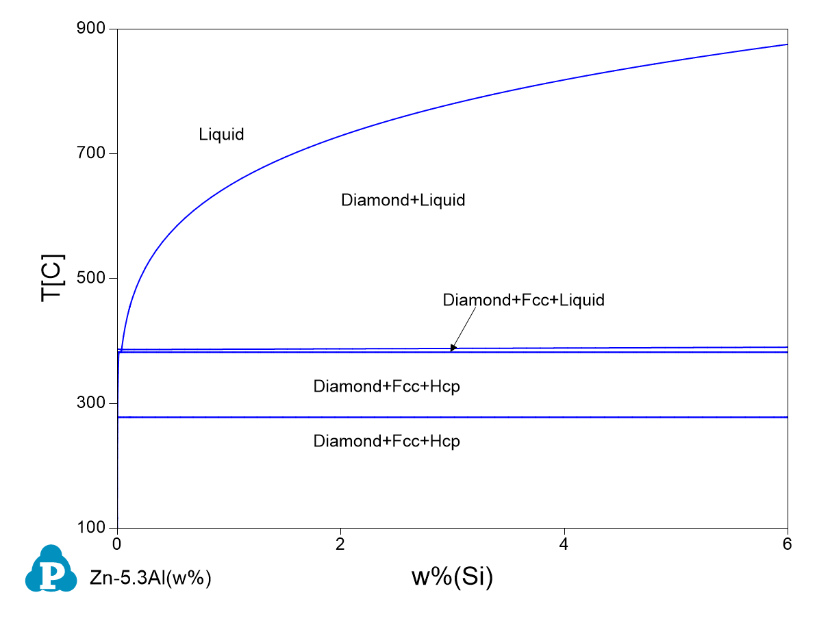 Berent et al [2016Ber]did the thermal analysis and microstructure observation of a serial of Zn-Al-Si alloys. The microstructure shows primary Si particles, Zn+Al eutectic structure and Zn+Al eutectoid structure. Figure 1.1 shows the calculated phase diagram of Zn-5.3Al-xSi (wt.%) section. The calculated result is in good agreement with their thermal analysis results and microstructure observations.